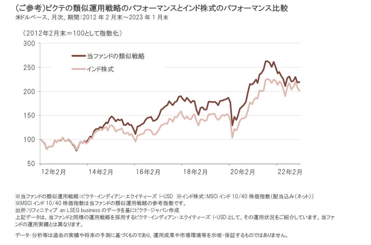 新興財閥アダニ・グループに対する疑惑などを受けて、2023年年初来のインド株式市場は大きく下落しています。こうした市場全体の流れを受けて、当ファンドの基準価額も下落しましたが、下落率は相対的に小幅に抑えられています。当ファンドでは、個別銘柄の丹念な調査に基づき、長期にわたって持続的に成長できる「質の高い企業」を厳選した上で、長期投資することを基本としています。