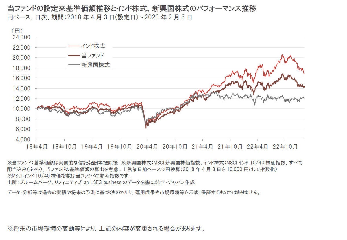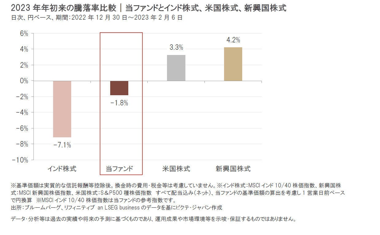 市場全体の流れを受けて、当ファンドの基準価額も2023年年初来、足元(2月6日)までで-1.8%の下落となりましたが、当該期間のインド株式の市場平均(ここではMSCIインド10/40株価指数)に比べると、下落率は小幅にとどまりました。