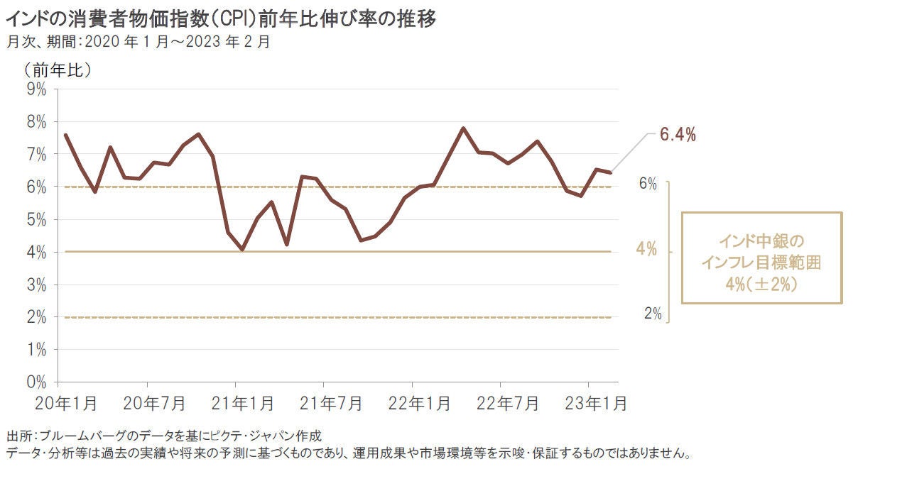 インドの2023年2月の消費者物価指数の前年比伸び率は、インド中銀のインフレ目標の上限(6%)をやや上回る水準です。