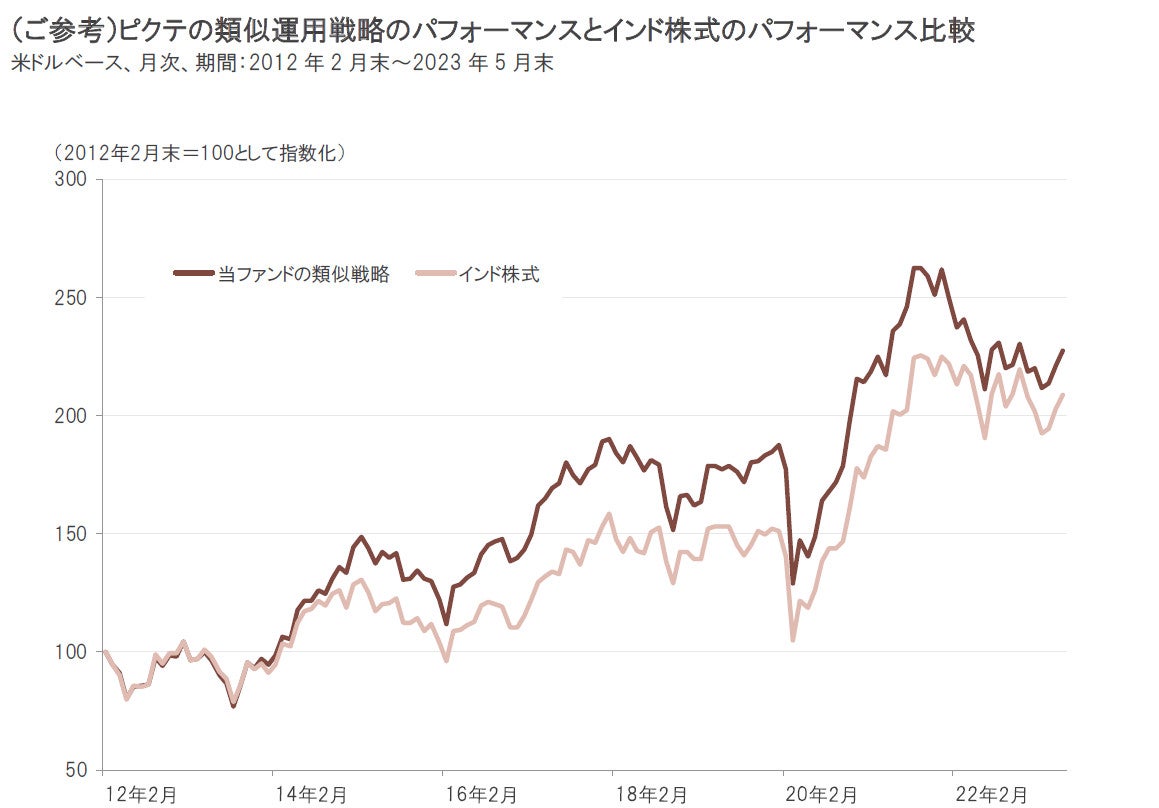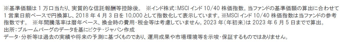 また、上昇率はインドの代表的な株価指数(MSCIインド10/40株価指数、配当込み、円換算ベース)(グラフ中では「インド株式」)を上回っています。※2023年6月5日時点の状況