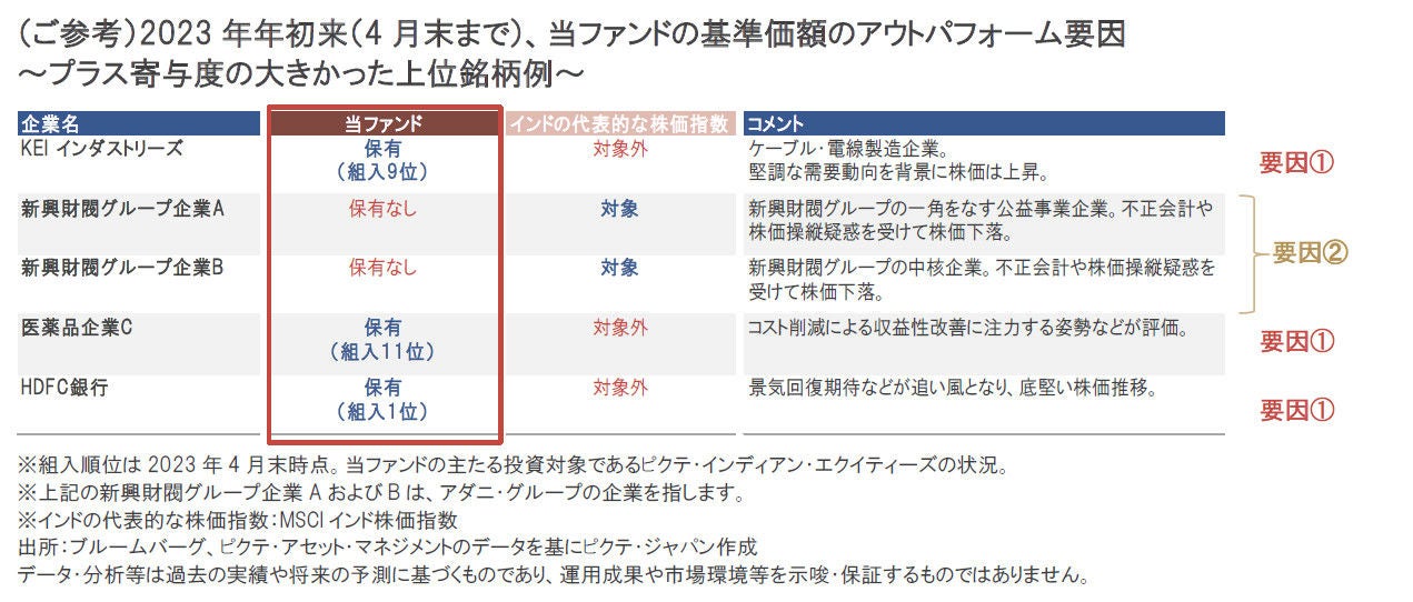 2023年年初来、当ファンドの基準価額が、インドの代表的な株価指数(MSCIインド10/40株価指数、配当込み、円換算ベース)(以下、株価指数)の上昇率を上回った(アウトパフォーム)要因には、株価指数の対象外で、魅力があると判断し、当ファンドで組入れていた企業の株価が上昇したこと(要因①)、株価指数の対象企業で、ガバナンスに対する懸念が高まり株価が急落した企業の株式を、当ファンドでは保有していなかったこと(要因➁)、などがありました。