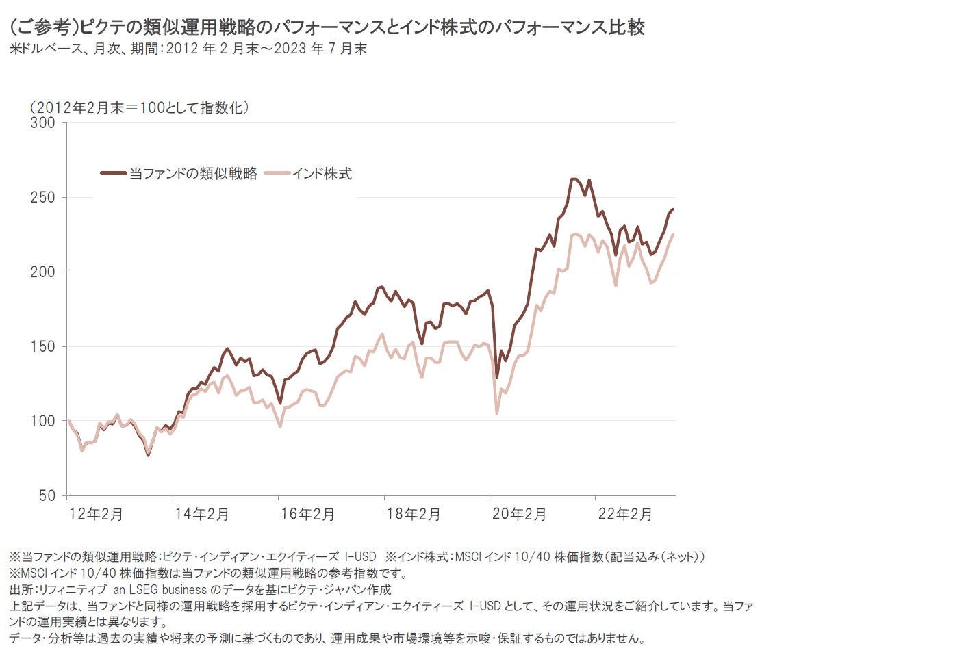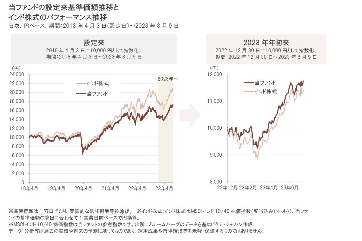 こうした市場環境下、当ファンドの基準価額は年初来で上昇基調が続いています。また、2023年年初来の上昇率は+17.4%と、参考指数(MSCIインド10/40株価指数、配当込み、円換算ベース)(下記グラフ中では「インド株式」)の+13.9%を上回っています。※2023年8月9日時点の状況