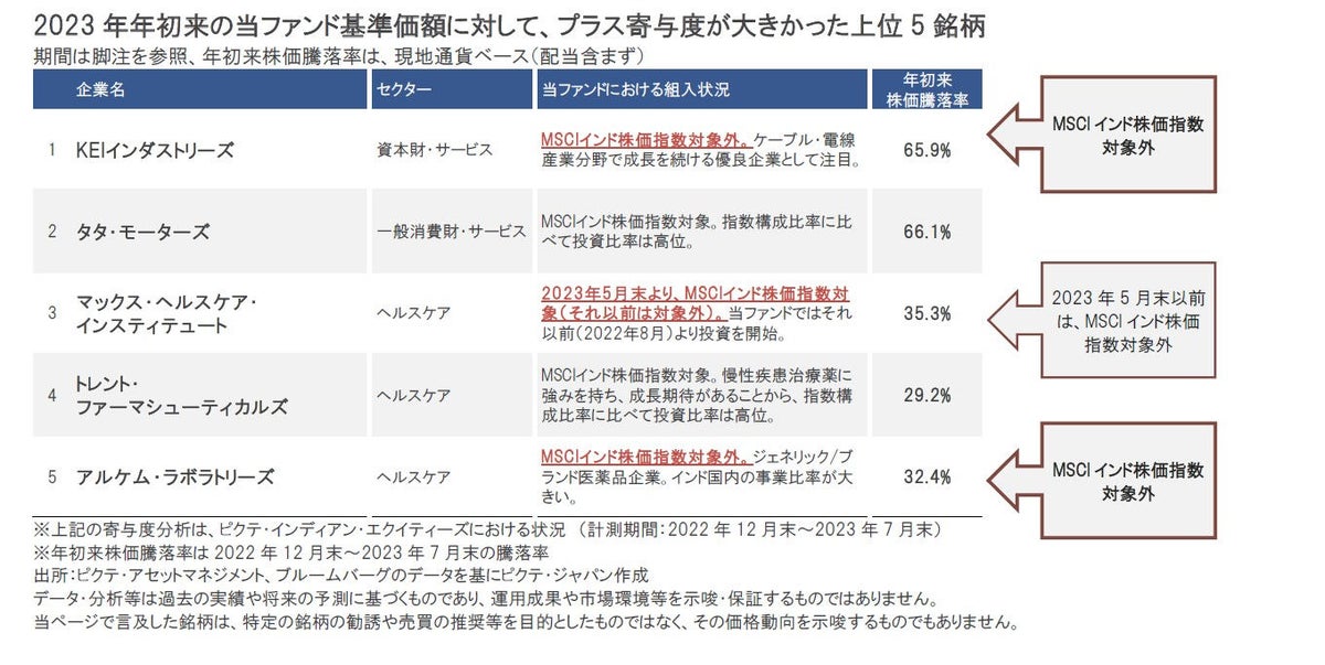 2023年年初来の当ファンドの基準価額の上昇に相対的に大きく貢献した銘柄の顔ぶれをみると、代表的なインドの株価指数の1つであるMSCIインド株価指数の対象外の、当ファンドの運用チームが優良企業であると独自に注目する企業が散見されました。また、MSCIインド株価指数の対象企業であっても、指数構成比率に比べて投資比率を高位としていた企業なども含まれました。