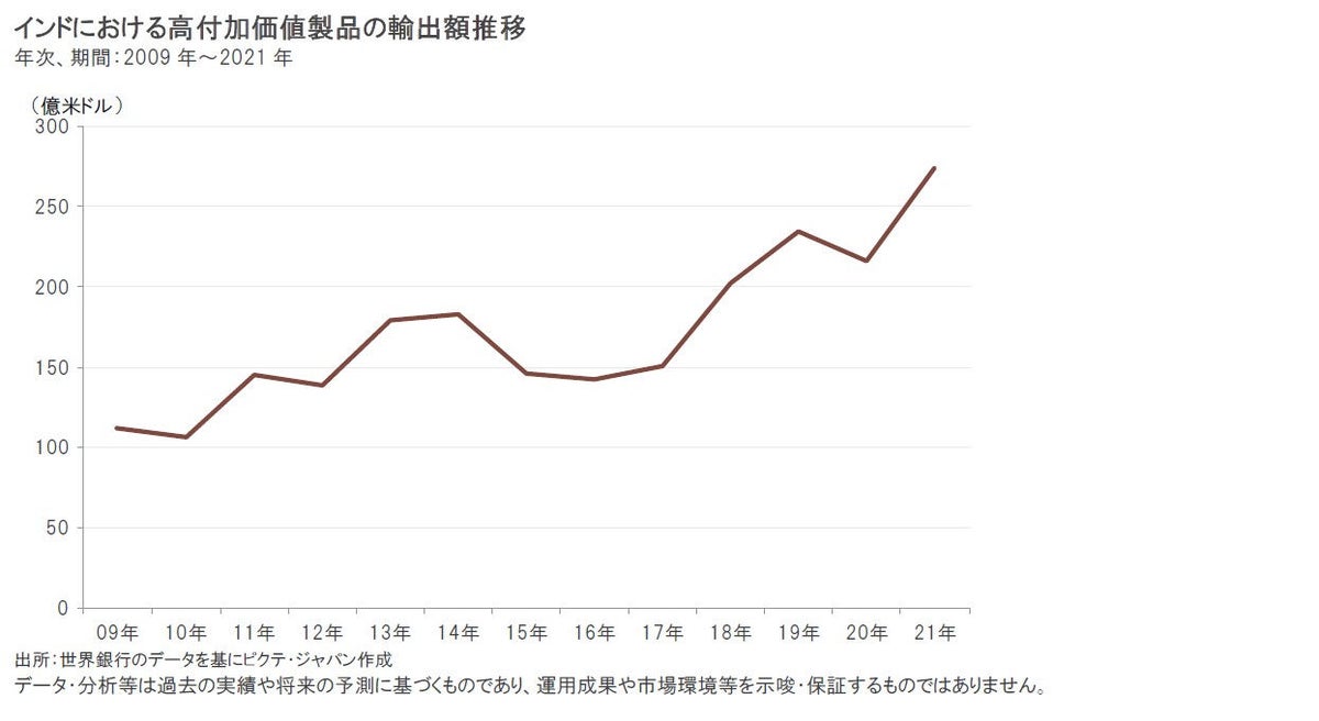 また、インドの国際的な競争力は、緩やかではあるものの、高まりつつあります。インド政府は近年、製造業の高度化に力を入れていますが、高付加価値製品の輸出は増加傾向にあり、今後も増加していくことが予想されています。