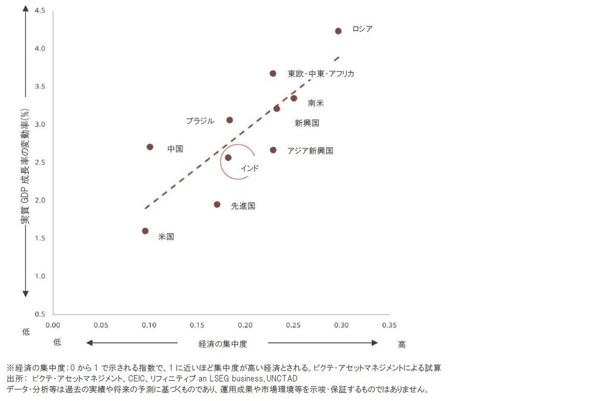 インドの実質GDP(国内総生産)成長率の過去20年間(2002年~2022年、四半期ベース)の変動率をみると、世界の主要国・地域と比べて相対的に変動率が低く、安定して高成長を実現してきました。この背景には、インドは経済の集中度(経済活動が特定の産業や特定の企業などに集中している程度)が世界の主要国・地域に比べて低い(=より多様性がある)ことなどがあるとみています。インドでは、多様な産業分野が発展し、消費市場は大きく拡大しています。その中で、数多くのプレイヤーが活発に事業を展開しています。