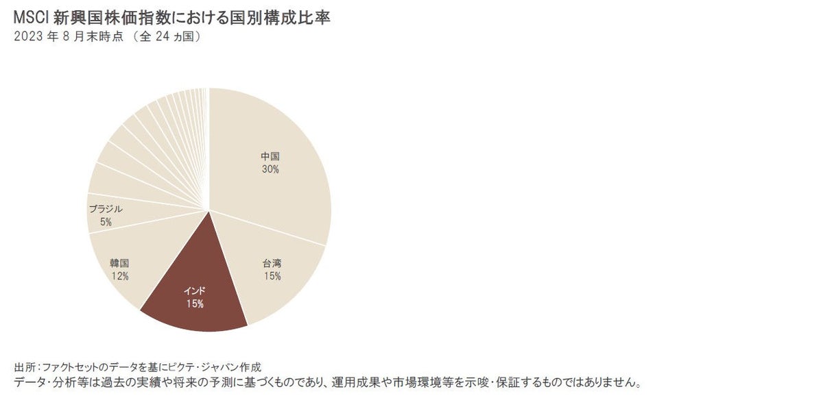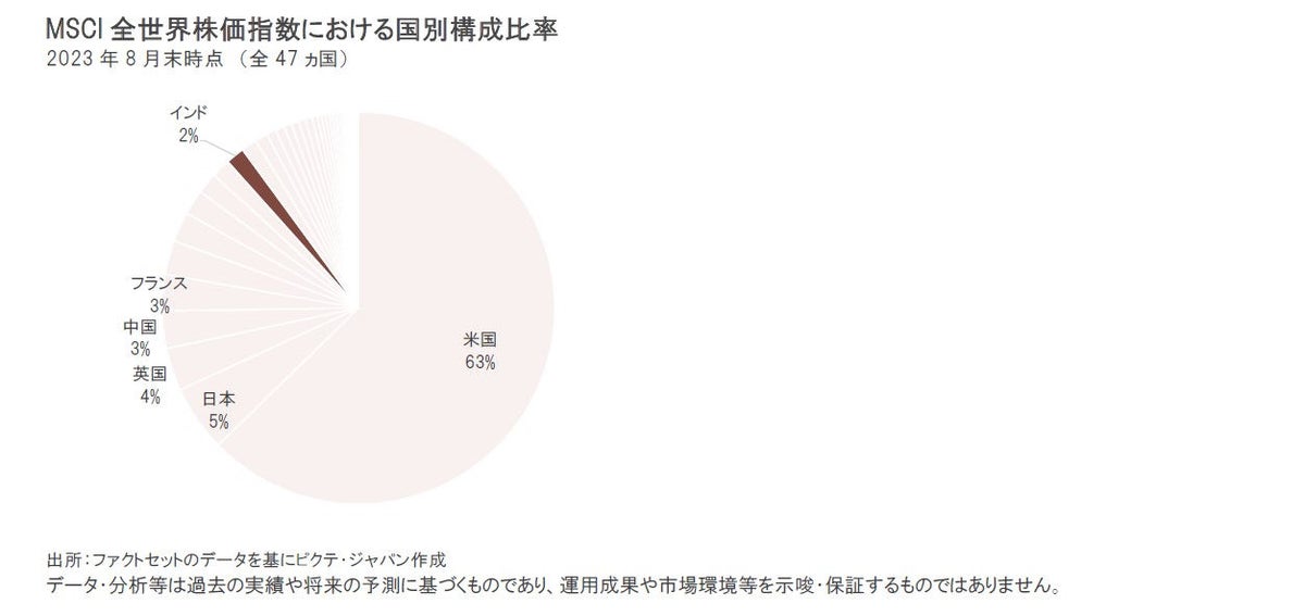 一方、例えば世界株式の代表的な株価指数であるMSCI全世界株価指数の国別構成比率をみると、インド株式の比率(2023年8月末時点で全体の2%)は依然として低位にとどまっています。
