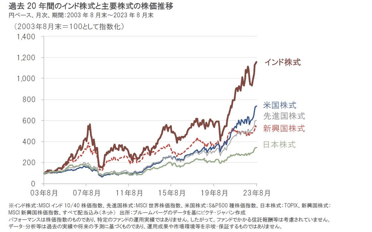 世界の政治・経済におけるインドの影響力の高まりに加えて、インド経済の成長力、インド企業の良好なファンダメンタルズ等を考慮すると、今後数年にわたって、インド株式は相対的に大きく上昇することが期待できるとみられ、世界の株式市場におけるインド株式の存在感は増していくものと考えています。