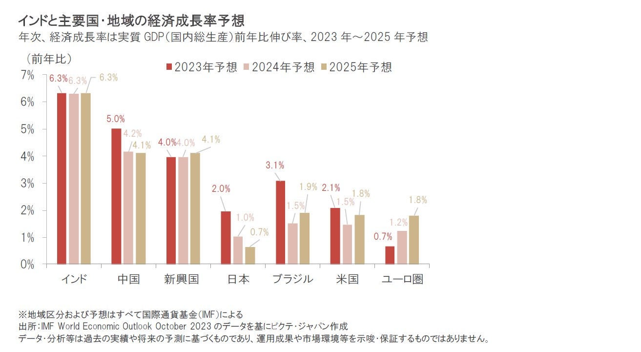 こうした中、インドについては、引き続き相対的に高い成長率が続くとの見通しには変わりがありませんでした。なお、2023年の成長率予想は、前回(2023年7月時点)から+0.2%ポイントの上方修正となりました。この背景は、主に堅調な内需があるとされています。