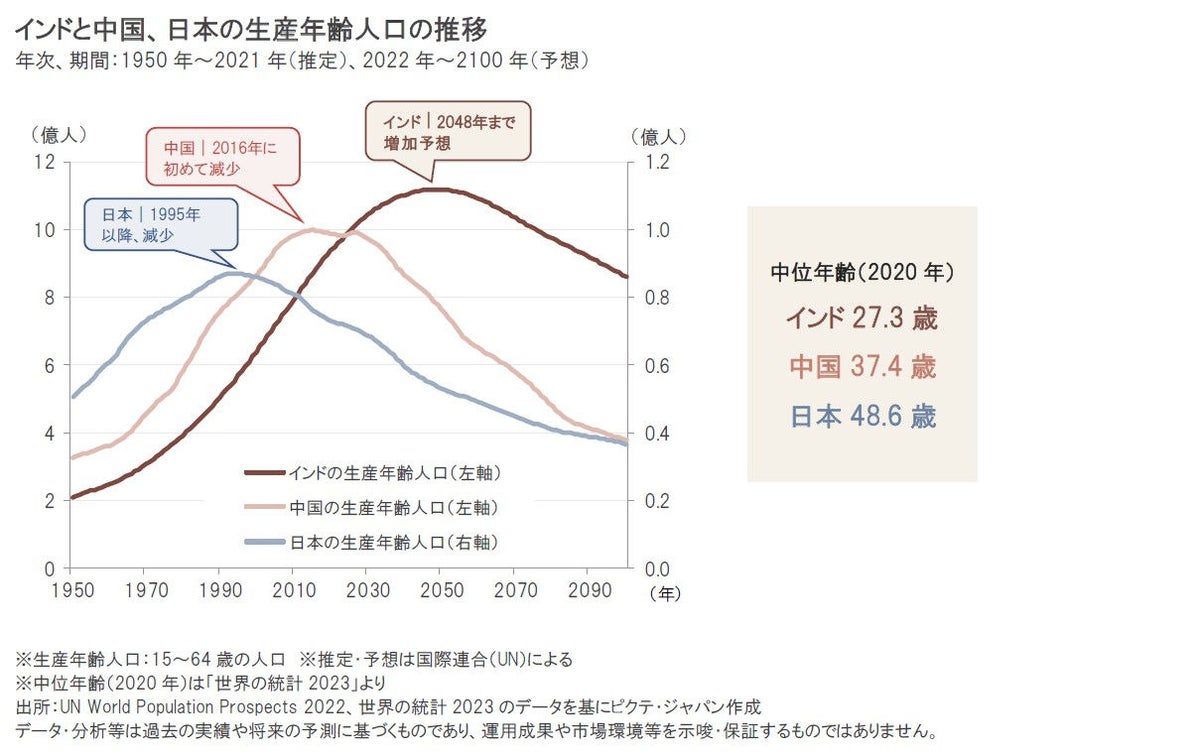 このような楽観的な見方の背景の1つには、今後もインド経済は相対的に高成長が続くと予想されていることがあります。インドは、若い人口を多く抱えており、こうした人々が労働を通じて所得を増加させ、消費を拡大させていくことが、経済成長の原動力となると期待されます。インドの生産年齢人口(=労働の担い手となる15歳~64歳の人口)は、2048年まで増加が予想されており、高齢化・人口減少に直面している日本や中国などとは対照的です。