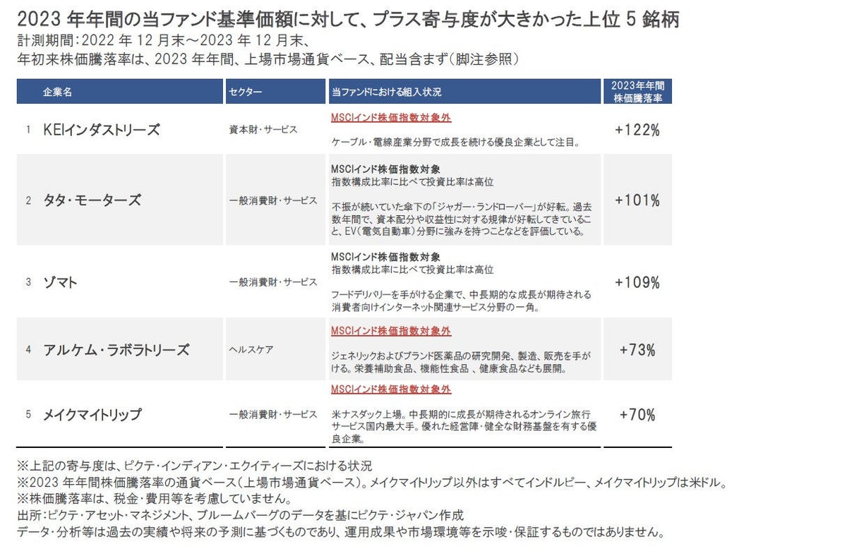 2023年年間の当ファンドの基準価額の上昇に相対的に大きく貢献した銘柄の顔ぶれをみると、代表的なインドの株価指数の1つであるMSCIインド株価指数の対象外の、当ファンドの運用チームが独自に注目する企業が散見されました。また、MSCIインド株価指数の対象企業であっても、指数構成比率に比べて投資比率を高位としていた企業なども含まれました。