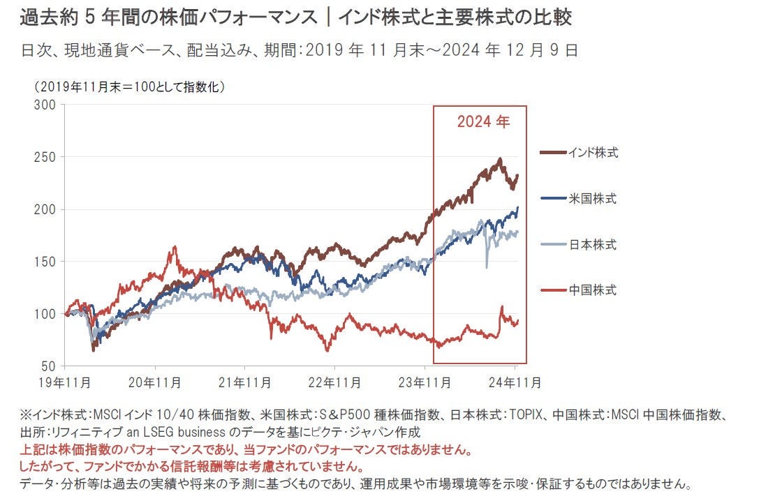 過去約5年間のインド株式(MSCIインド10/40株価指数)の株価パフォーマンスは、米国株式などの主要株式を上回って推移しています(2024年12月9日時点、現地通貨ベース、配当込み)。