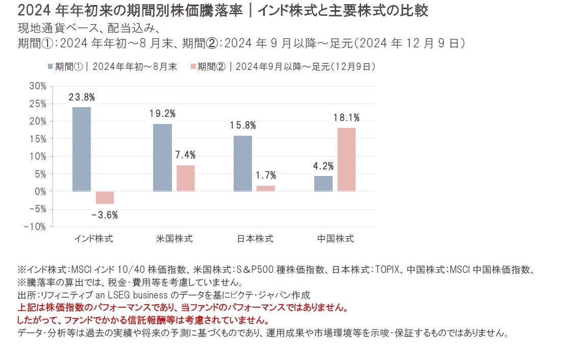 ●2024年のインド株式市場も足元までで上昇。ただし、9月をピークに、その後は相対的にやや低調な動き