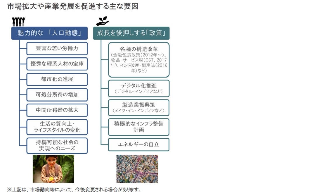 これらの分野は、インドの魅力的な「人口動態」や成長を後押しする「政策」によって、市場の拡大や産業の発展が期待できるという点で共通しているとみられます。