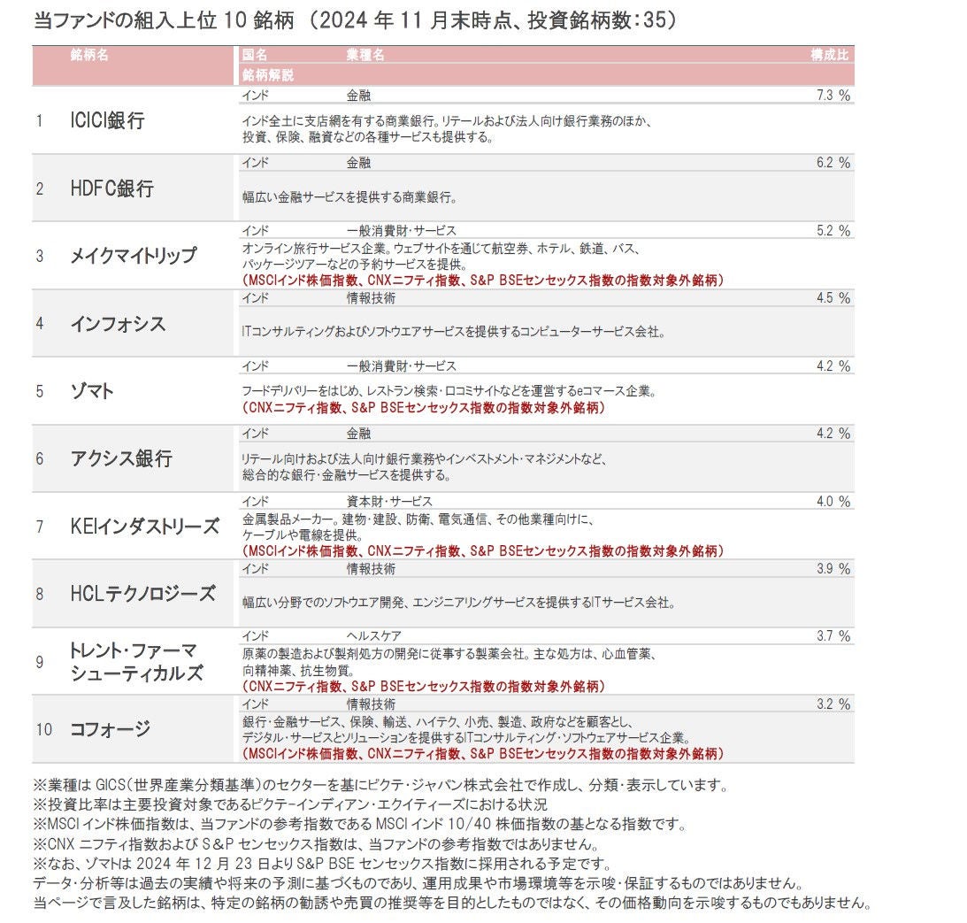 2024年11月末時点の当ファンドの組入銘柄数は、35銘柄です。また、インド株式をより広くカバーしているMSCIインド株価指数(156銘柄)との重複は20銘柄、それ以外の15銘柄は、株価指数に採用されていない銘柄です。