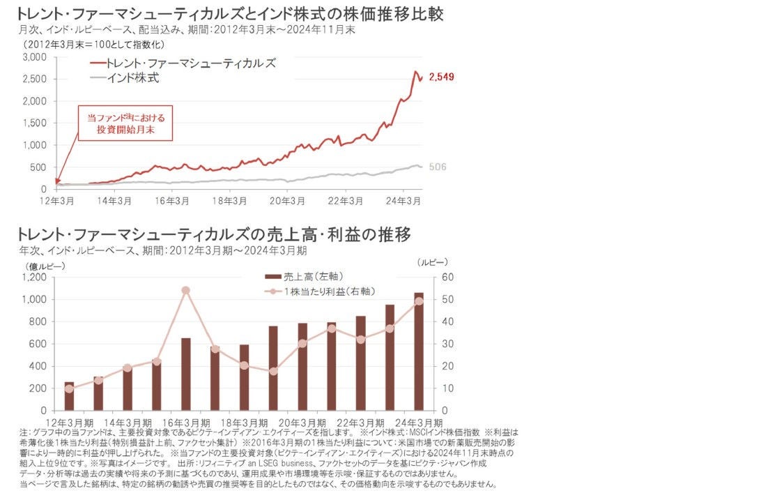 2024年11月末時点で当ファンドの組入上位9位のトレント・ファーマシューティカルズは、インドの大手製薬会社の一角を占めています。同社は、注目分野の1つである「ヘルスケア」の銘柄です。
