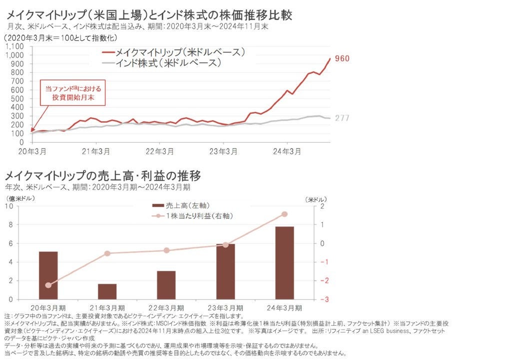 2024年11月末時点で当ファンドの組入上位3位のメイクマイトリップは、インド最大級のオンライン旅行サービス企業です。同社は、注目分野の1つである「インターネット・エコノミー」の銘柄です。