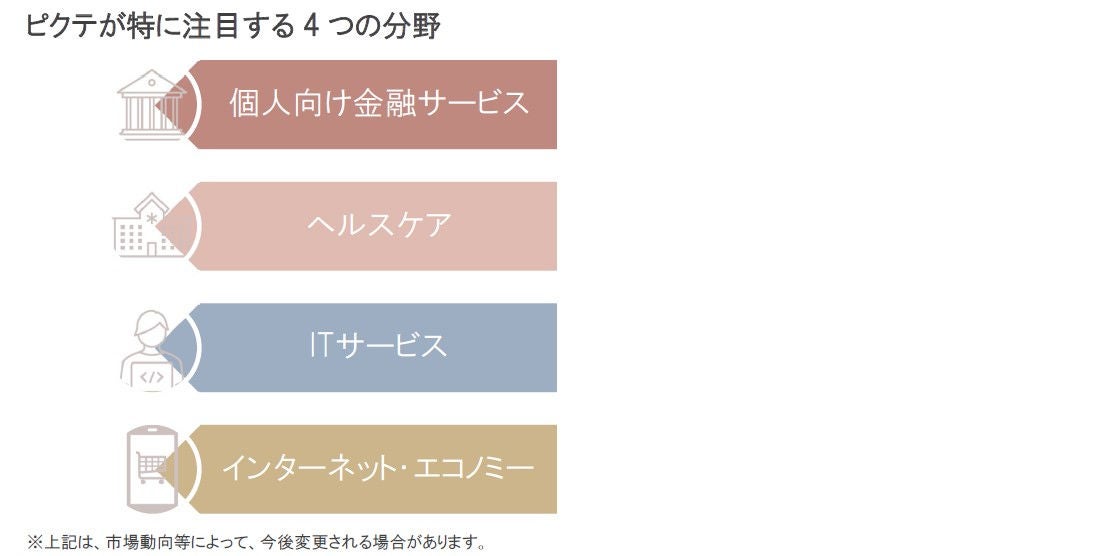 前述の注目する4つの分野については、今後も中長期的な成長が期待できるとの見方に変わりがありません。また、最近では、4つの分野以外にも「消費財」分野に投資機会があるとみています。