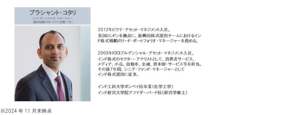 運用チームは、インド出身で、20年以上の運用経験を持つ、まさにインドを知り尽くしたプラシャント・コタリがリード・マネージャーを務めています。