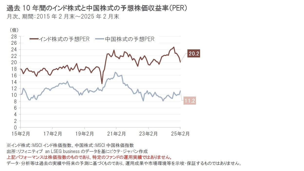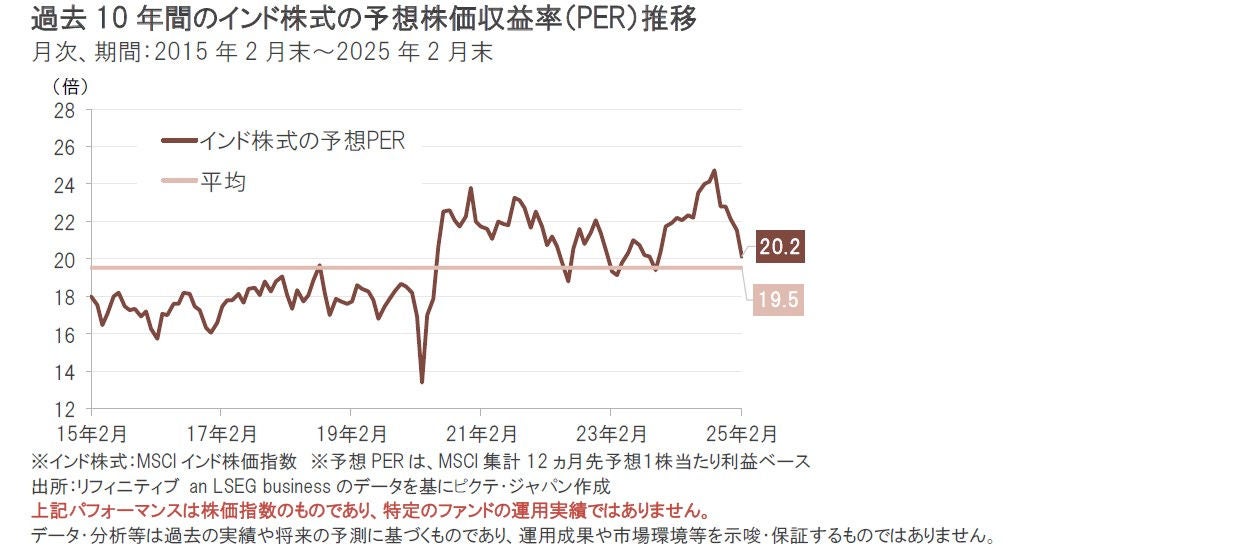 短期的には、米トランプ大統領の関税政策や、米国の景気動向、金融政策動向などを巡る見方などが世界の株式市場を大きく変動させる可能性があり、インド株式市場もこうした影響を受ける懸念があります。インド株式のバリュエーション水準は、足元で低下し、相対的に過度な割高感が解消されつつあるものの、依然として過去平均を上回る水準ではあり、引き続き警戒を怠るべきではないと考えられます。
