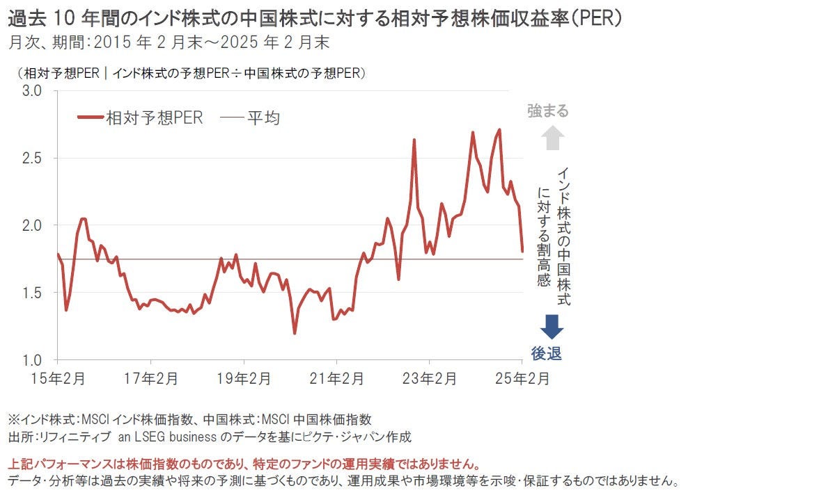 前述のとおり、高い成長力に対する期待を背景に、インド株式の予想PERは依然として相対的に高水準にはありますが、インド株式の中国株式に対する相対予想PERをみると、足元で大きく低下しました。インド株式の相対的に過度な割高感は解消しつつあるとみることもできると考えられます。