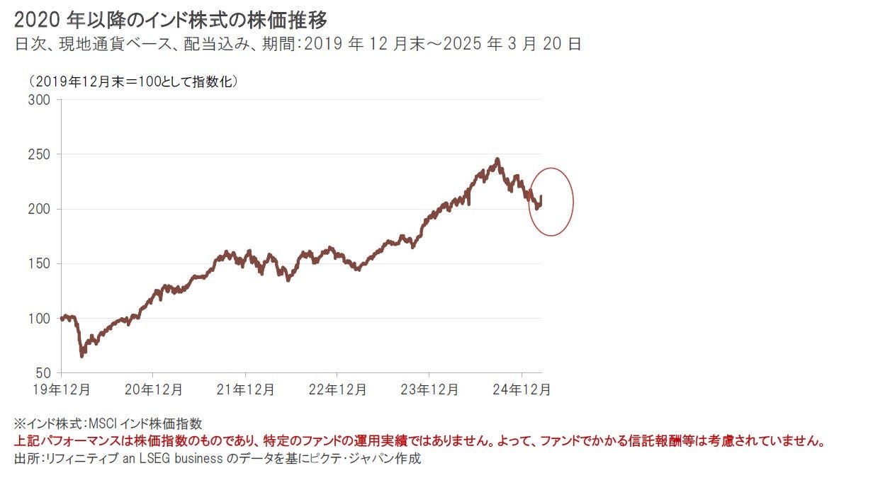 インド株式は、2024年9月以降、それまで過去数年間続いてきた力強い上昇トレンドから一転して、2025年2月後半にかけて下落基調となりました。ただし、3月以降は、やや持ち直しの兆しもみられています。