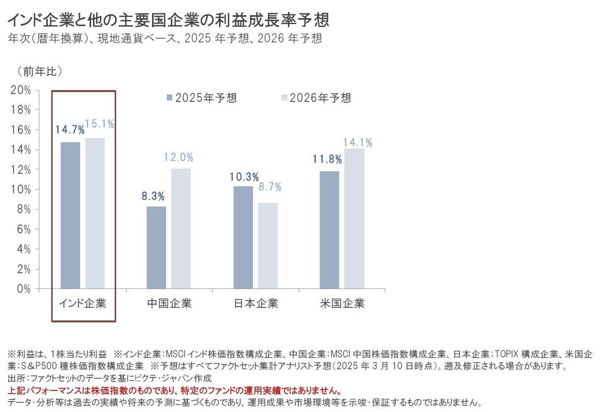 しかし、現時点では、インド企業の2025年および2026年(いずれも暦年換算ベース)の利益成長率予想は相対的に高い成長が見込まれています。また、インド経済の成長率についても、世界の中でも高い成長率が予想されています。インドの相対的に高い成長力には変わりはありません。今後も中長期的にみれば、成長力を背景に、インド株式の上昇トレンドは続くものと期待されます。