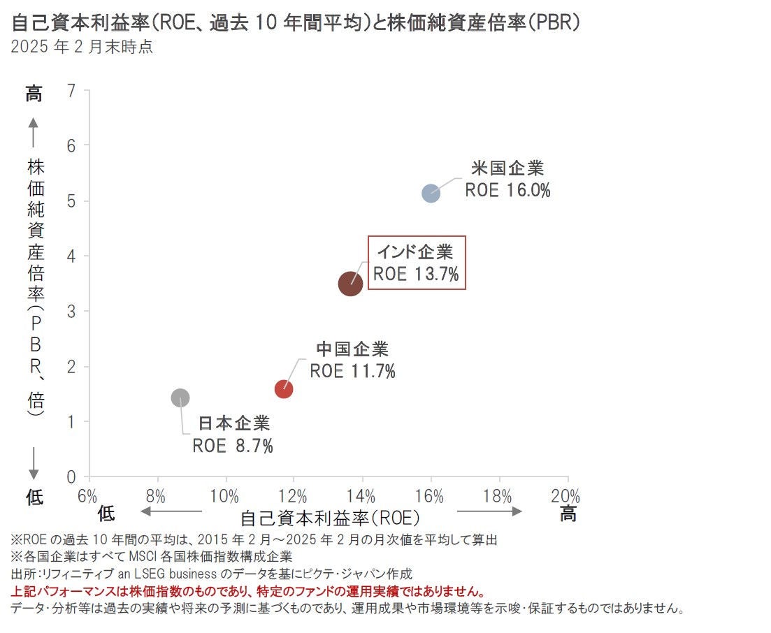 また、インド企業は企業のファンダメンタルズ(基礎的条件)が相対的に健全であることも、インド株式が相対的に高いバリュエーション水準にあることの裏付けになるとみられます。インド企業の過去10年間の平均自己資本利益率(ROE)は、中国企業や日本企業に比べて高水準にあり、相対的に財務基盤が健全で、経営効率が高いと考えられます。