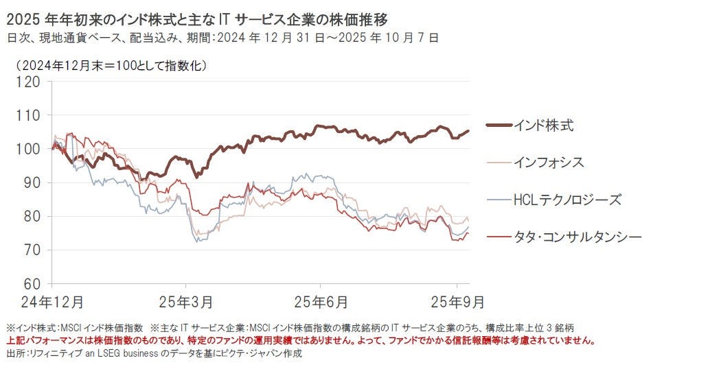 その一方、2025年9月には米議会で外国に業務委託(アウトソーシング)を行う米国企業に25%の税金を課す案が浮上したほか、トランプ米大統領が専門技術を持つ外国人向けビザ制度(H1Bビザ)を大幅に見直し、厳格化する大統領令に署名したことなどを受けて、ITサービス企業の株価は、低調な動きとなっています。