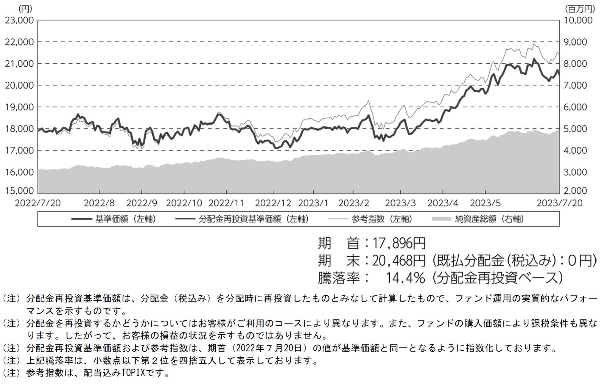 当ファンドは2023年7月20日に第7期の決算を行いました。当期(2022年7月20日(第7期首)~2023年7月20日(第7期末))の基準価額は、14.4%の上昇となりました。