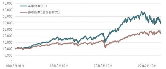 ※参考指数(全世界株式):MSCI全世界株価指数(配当込み)、当ファンドの基準価額の算出に合わせて株価指数は1営業日前、当日為替レートで円換算、2016年2月19日=10,000として指数化