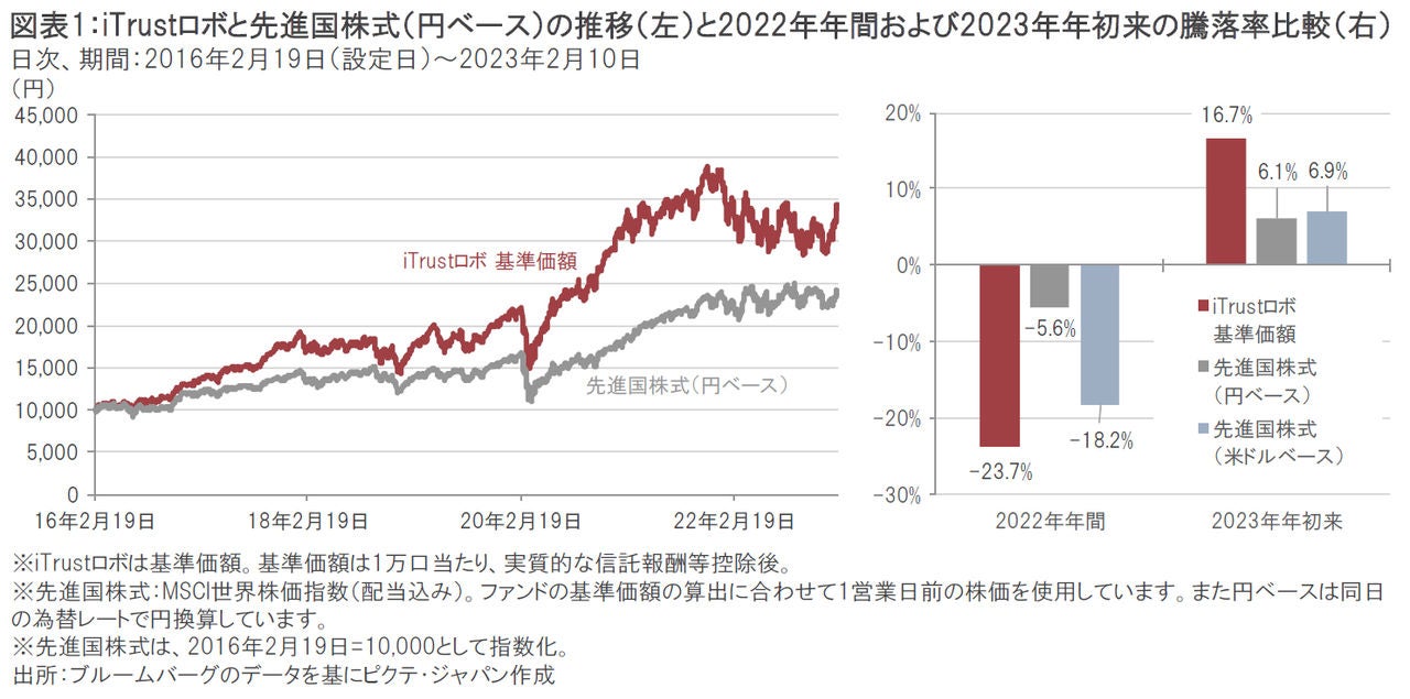 ● iTrustロボの2022年のパフォーマンスは先進国株式を大きく下回る、一方、2023年は大きく上昇