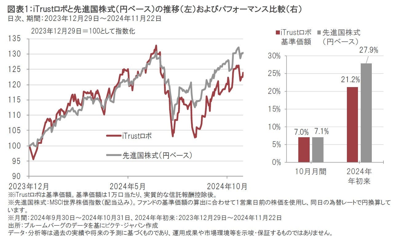 当ファンドの基準価額は、2024年10月(2024年9月30日~2024年10月31日)に7.0%の上昇となり、同期間の先進国株式(配当込み、円換算)の7.1%をわずかに下回る上昇となりました(図表1参照)。