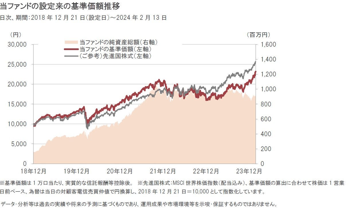 世界のセキュリティ関連企業の株式に投資を行う当ファンドのマザーファンドの基準価額は、2023年年間で+31%の上昇となりました。同期間における先進国株式(MSCI世界株価指数、円換算ベース、+32%)と同程度の上昇率となりました。また、2024年に入っても同様に上昇基調が続いています。