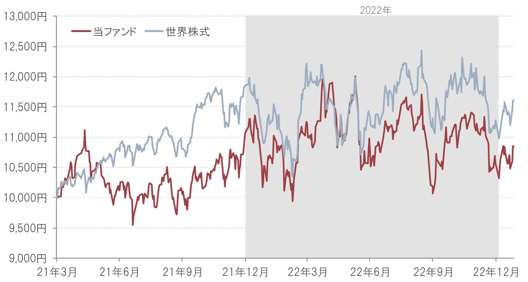 日次、期間:2021年3月31日(当ファンド設定日)~2023年1月25日、世界株式は2021年3月31日=10,000円として指数化、グレーの網掛け部分は2022年