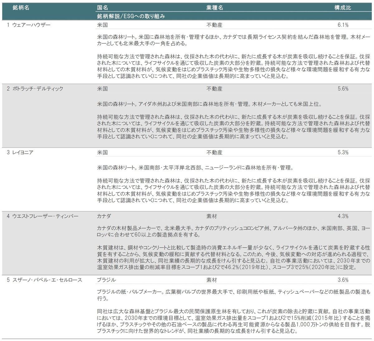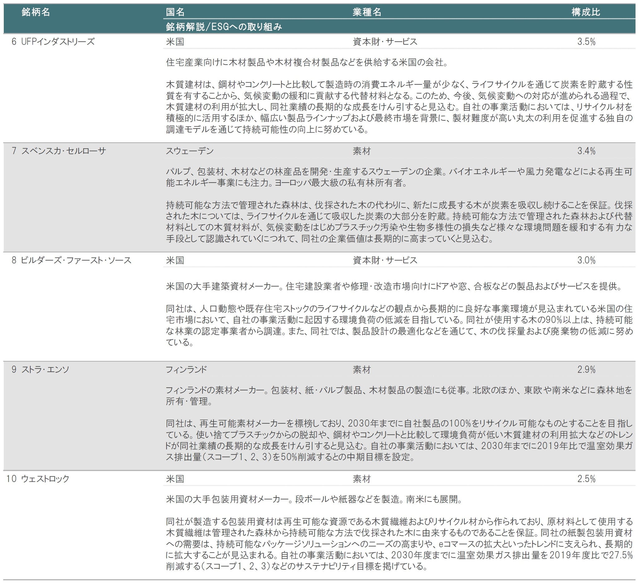 業種別構成比は、素材が49.5%と比較的大きな比率を占めています。素材には、木材製品関連や包装材関連、紙製品関連の銘柄などが含まれます。その他の組入業種は、不動産(北米を基盤とする森林リート)、一般消費財・サービス(住宅建設業者やホームセンター運営会社など)、資本財・サービス(建築資材メーカーや産業機器メーカーなど)、生活必需品(衛生用品メーカーなど)などとなっています。