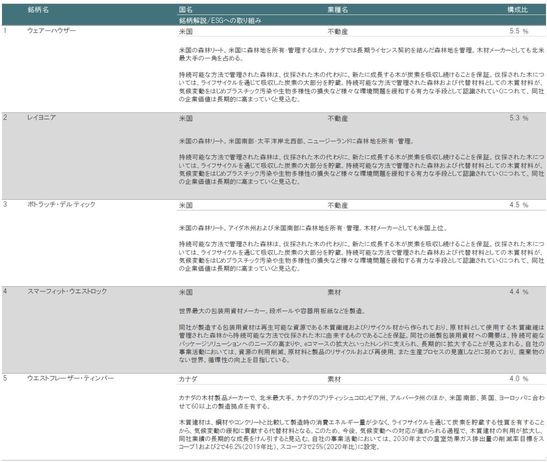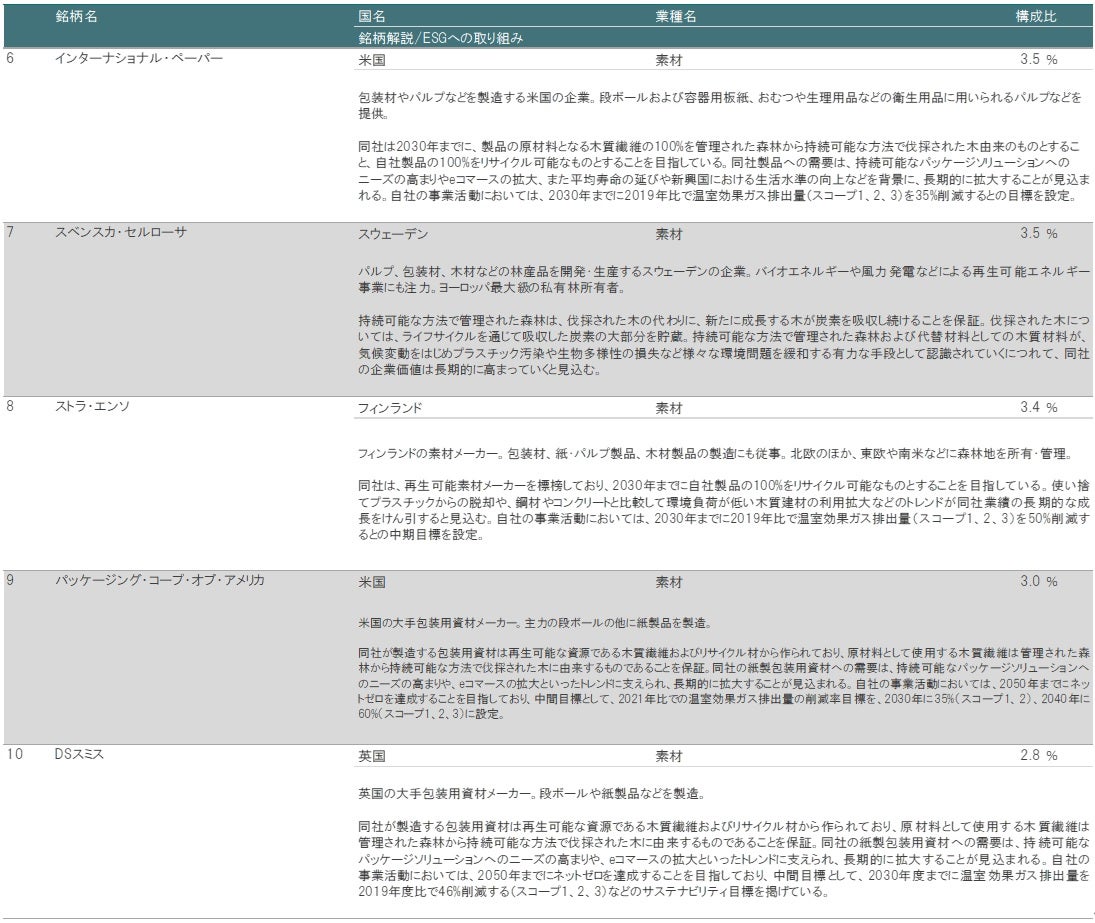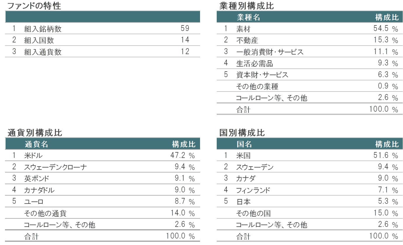 業種別構成比は、素材が54.5%と過半を占めています。素材には、木材製品関連や包装材関連、紙製品関連の銘柄などが含まれます。その他の組入業種は、不動産(北米を基盤とする森林リート)、一般消費財・サービス(住宅建設業者やホームセンター運営会社など)、生活必需品(衛生用品メーカーなど)、資本財・サービス(建築資材メーカーや産業機器メーカーなど)などとなっています。