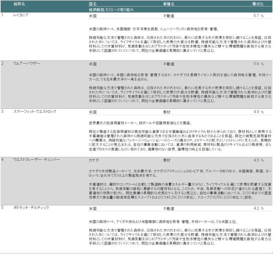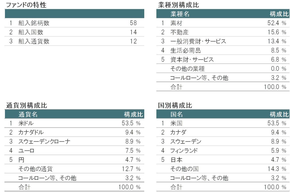 業種別構成比は、素材が52.4%と過半を占めています。素材には、木材製品関連や包装材関連、紙製品関連の銘柄などが含まれます。その他の組入業種は、不動産(北米を基盤とする森林リート)、一般消費財・サービス(住宅建設業者やホームセンター運営会社など)、生活必需品(衛生用品メーカーなど)、資本財・サービス(建築資材メーカーや産業機器メーカーなど)などとなっています。