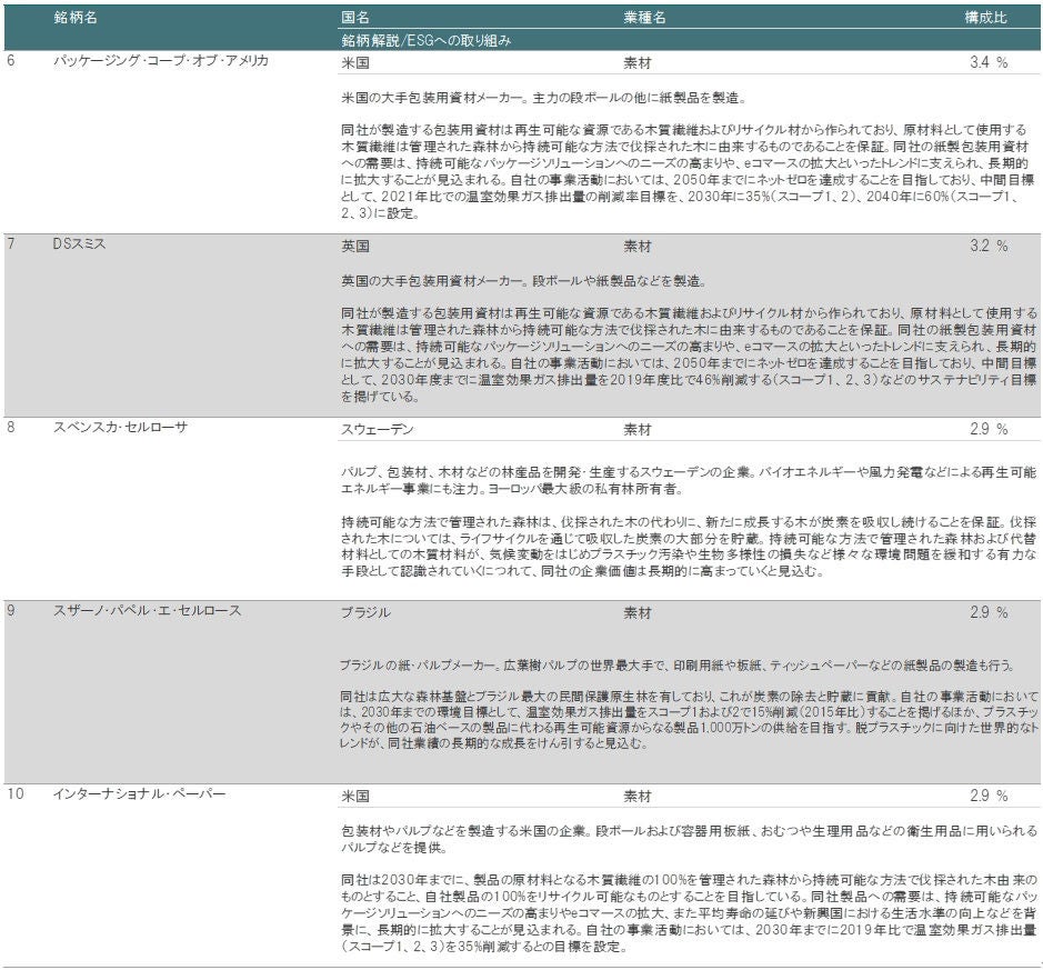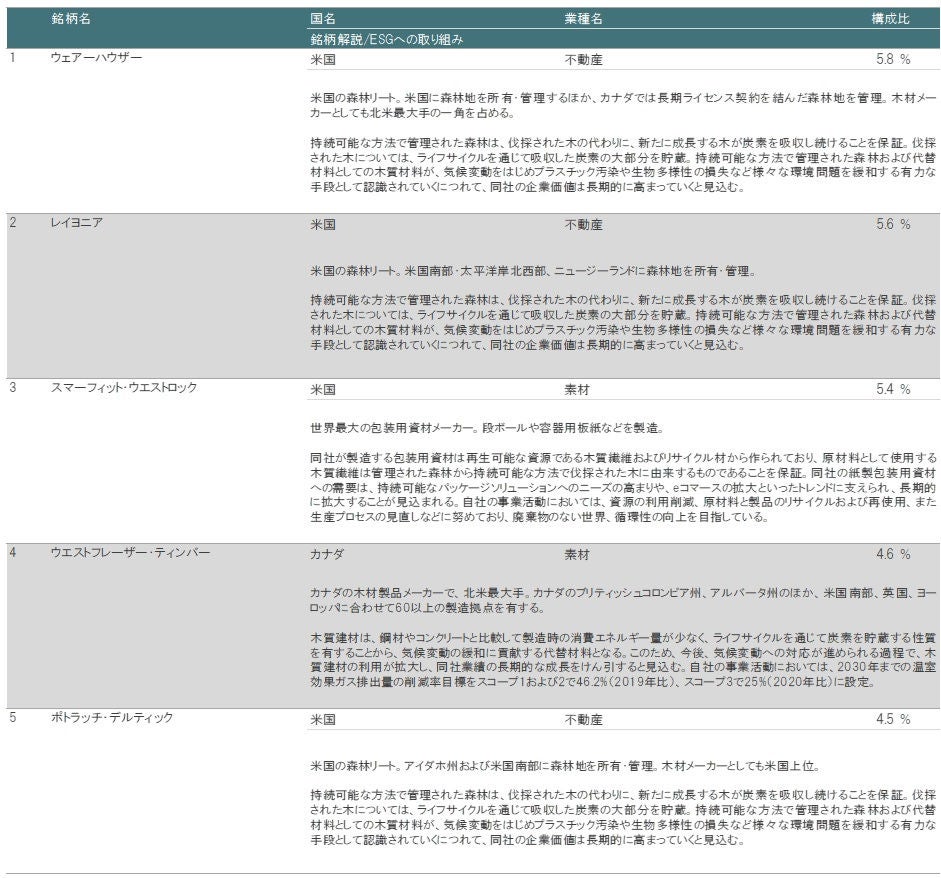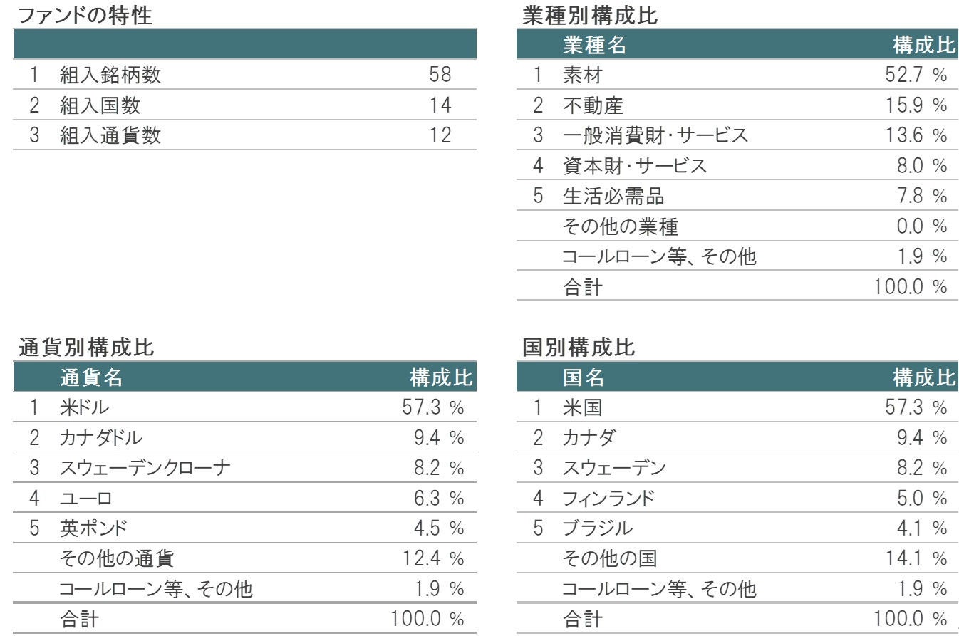 業種別構成比は、素材が52.7%と過半を占めています。素材には、木材製品関連や包装材関連、紙製品関連の銘柄などが含まれます。その他の組入業種は、不動産(北米を基盤とする森林リート)、一般消費財・サービス(住宅建設業者やホームセンター運営会社など)、資本財・サービス(建築資材メーカーや産業機器メーカーなど)、生活必需品(衛生用品メーカーなど)などとなっています。