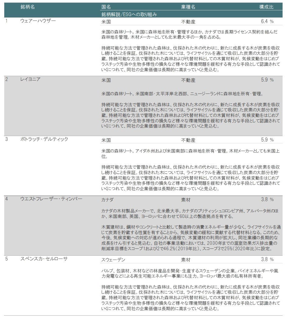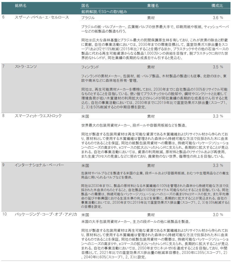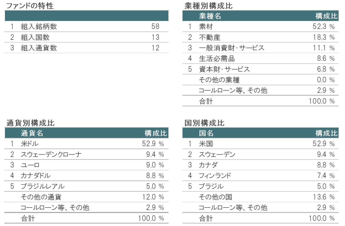 業種別構成比は、素材が52.3%と過半を占めています。素材には、木材製品関連や包装材関連、紙製品関連の銘柄などが含まれます。その他の組入業種は、不動産(北米を基盤とする森林リート)、一般消費財・サービス(住宅建設業者やホームセンター運営会社など)、生活必需品(衛生用品メーカーなど)、資本財・サービス(建築資材メーカーや産業機器メーカーなど)などとなっています。