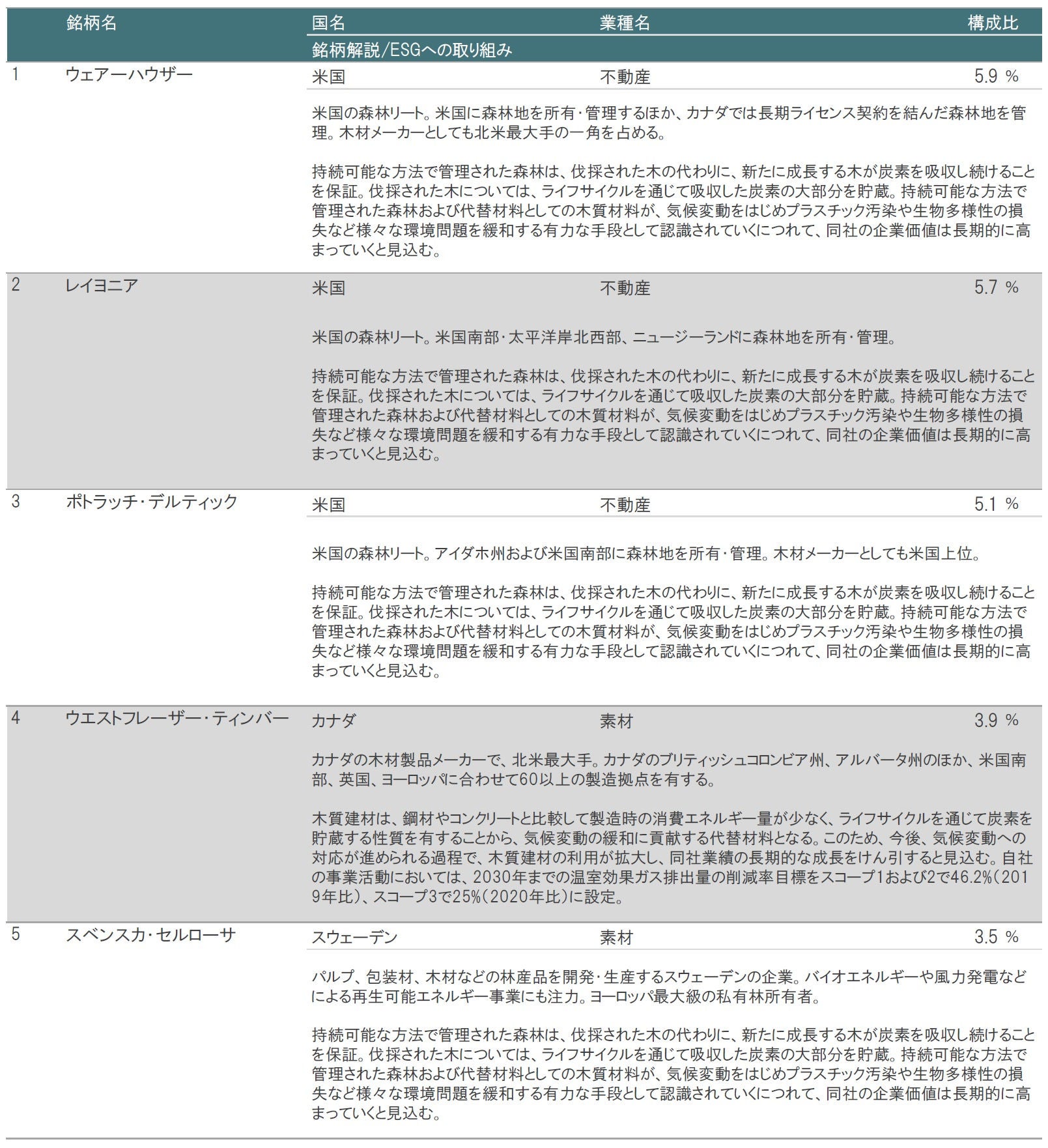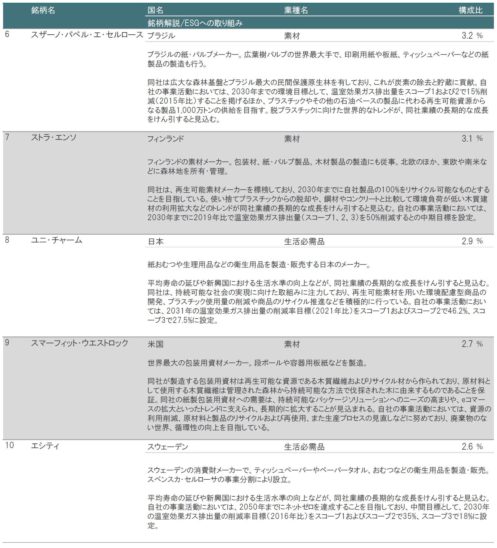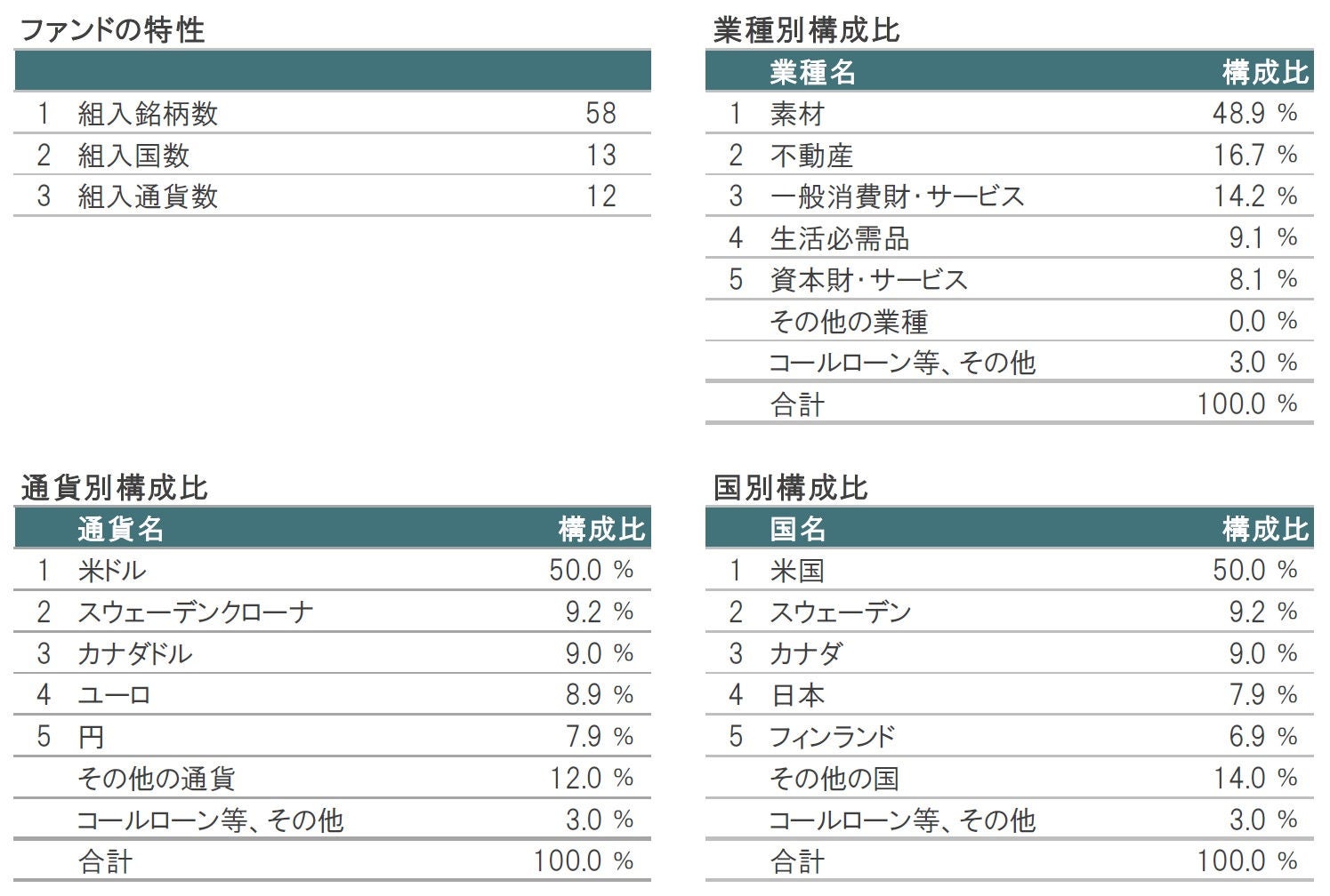 業種別構成比は、素材が48.9%と半分近くを占めています。素材には、木材製品関連や包装材関連、紙製品関連の銘柄などが含まれます。その他の組入業種は、不動産(北米を基盤とする森林リート)、一般消費財・サービス(住宅建設業者やホームセンター運営会社など)、生活必需品(衛生用品メーカーなど)、資本財・サービス(建築資材メーカーや産業機器メーカーなど)などとなっています。