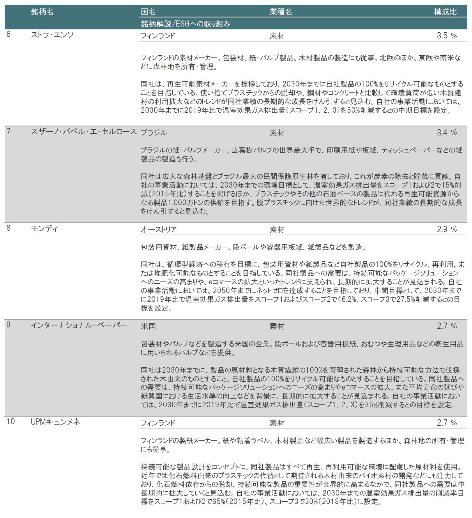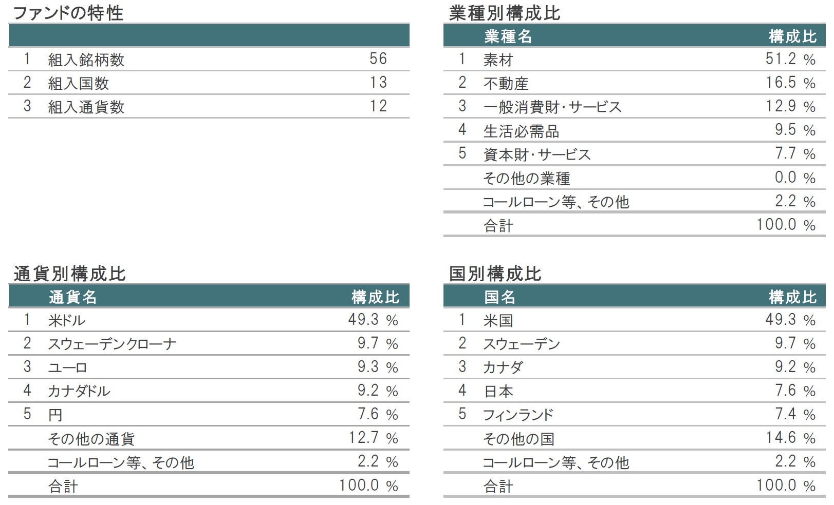 業種別構成比は、素材が51.2%と過半を占めています。素材には、木材製品関連や包装材関連、紙製品関連の銘柄などが含まれます。その他の組入業種は、不動産(北米を基盤とする森林リート)、一般消費財・サービス(住宅建設業者やホームセンター運営会社など)、生活必需品(衛生用品メーカーなど)、資本財・サービス(建築資材メーカーや産業機器メーカーなど)などとなっています。