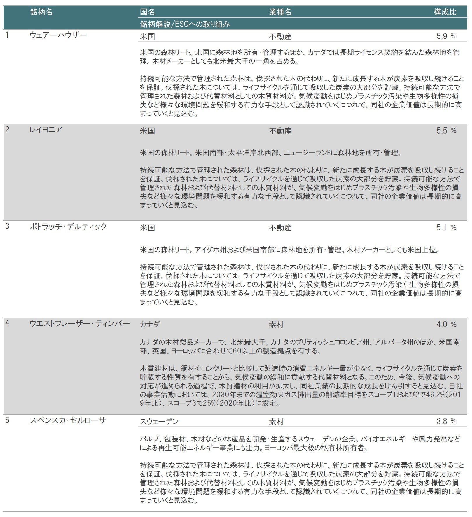 ※上記は当ファンドの主たる投資対象であるピクテ-ティンバーの状況です。 ※業種はGICS(世界産業分類基準)のセクターを基にピクテ・ジャパンで作成し、分類・表示しています。 ※表で示した組入銘柄は、特定の銘柄の勧誘や売買の推奨等を目的としたものではなく、その価格動向を示唆するものでもありません。