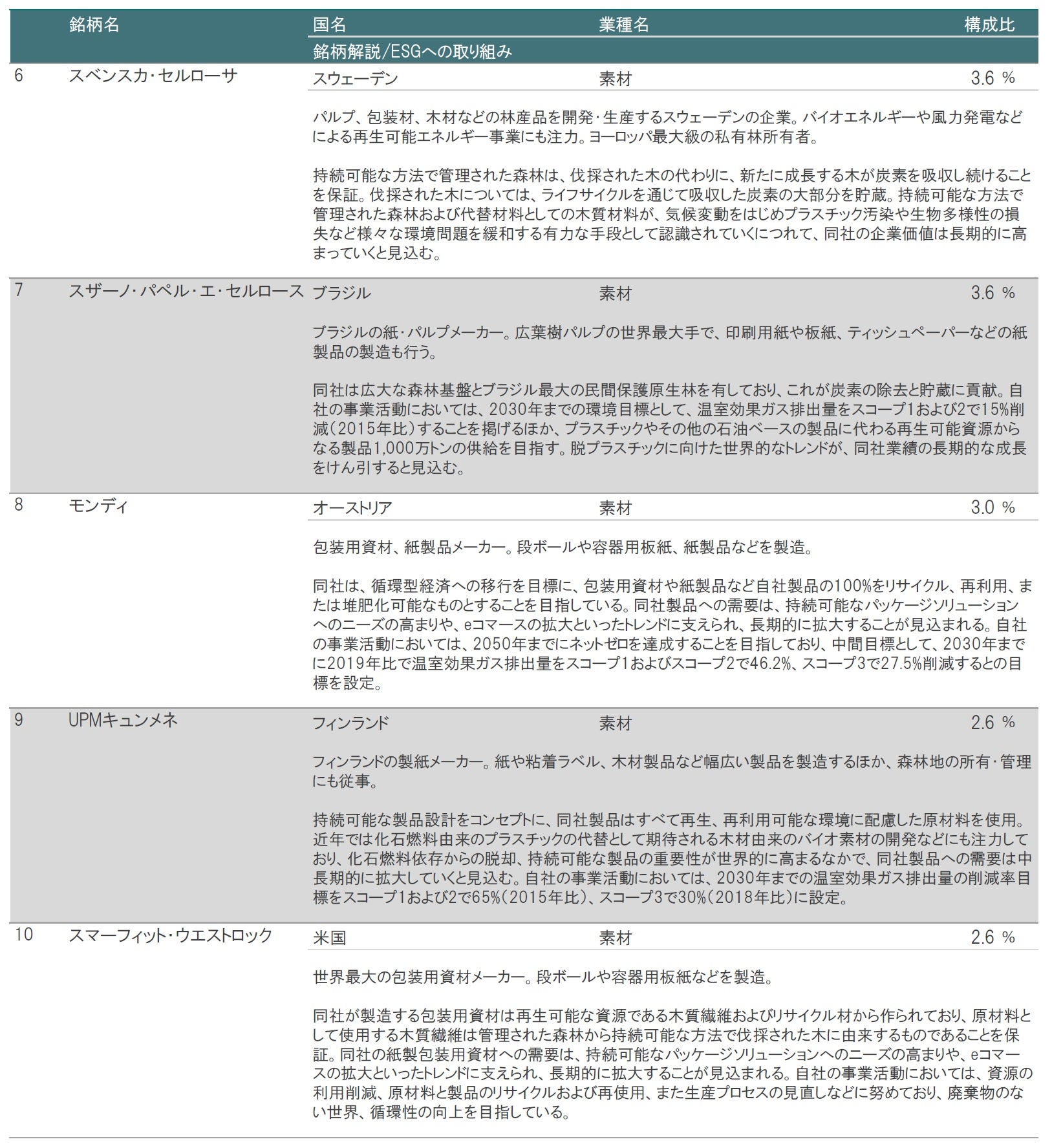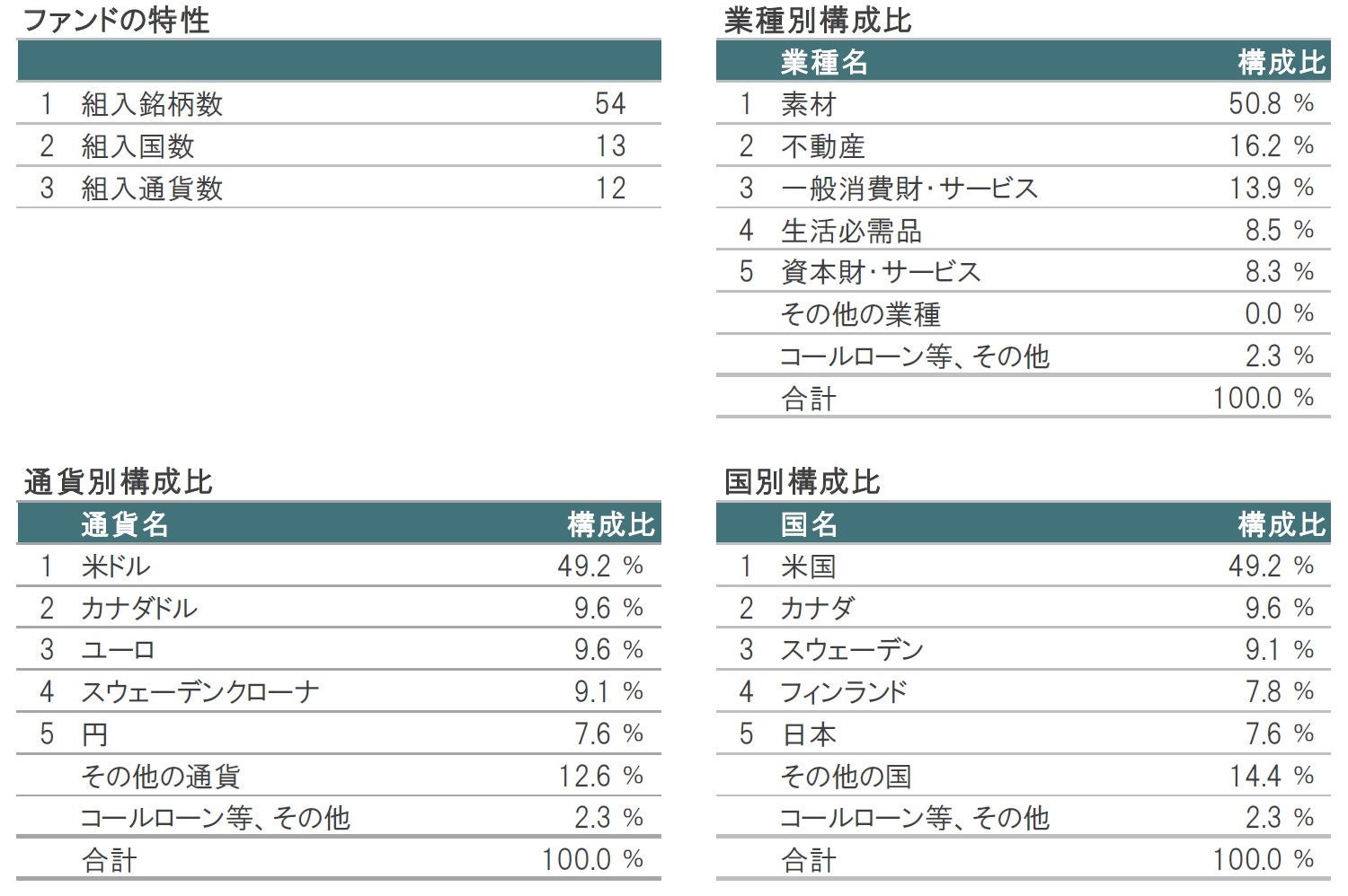 業種別構成比は、素材が50.8%と過半を占めています。素材には、木材製品関連や包装材関連、紙製品関連の銘柄などが含まれます。その他の組入業種は、不動産(北米を基盤とする森林リート)、一般消費財・サービス(住宅建設業者やホームセンター運営会社など)、生活必需品(衛生用品メーカーなど)、資本財・サービス(建築資材メーカーや産業機器メーカーなど)などとなっています。