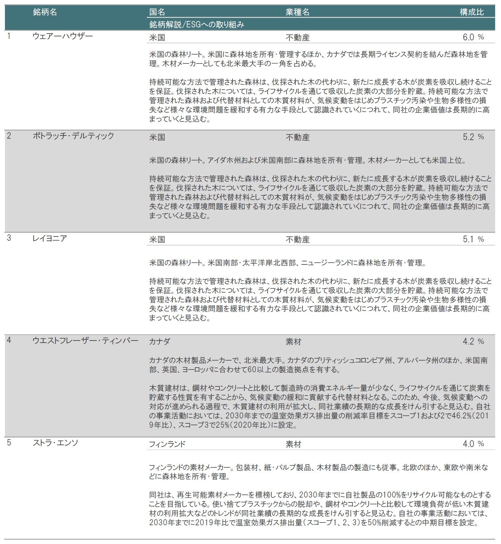 ※上記は当ファンドの主たる投資対象であるピクテ-ティンバーの状況です。 ※業種はGICS(世界産業分類基準)のセクターを基にピクテ・ジャパンで作成し、分類・表示しています。 ※表で示した組入銘柄は、特定の銘柄の勧誘や売買の推奨等を目的としたものではなく、その価格動向を示唆するものでもありません。
