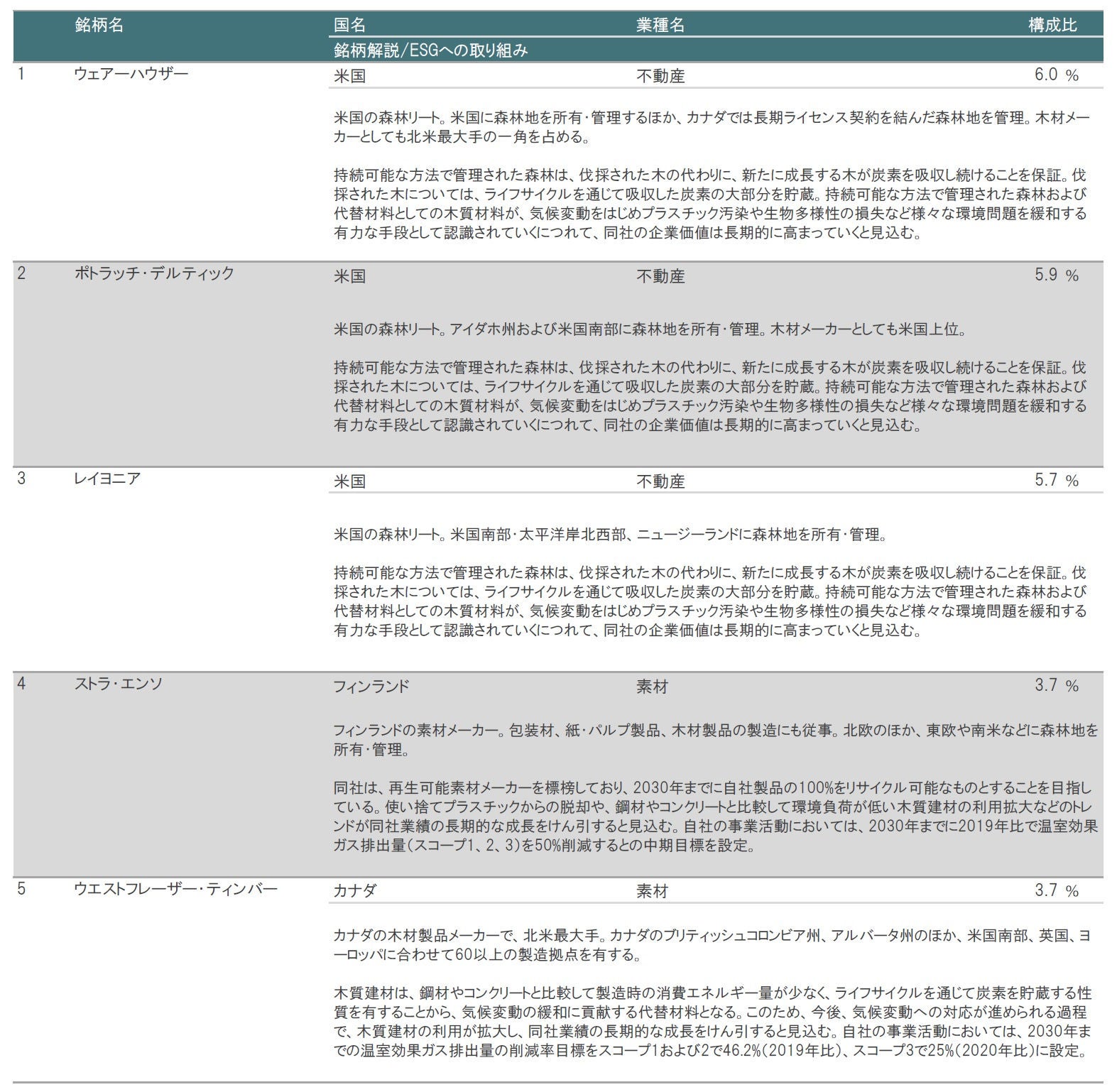 業種別構成比は、素材が50.4%と過半を占めています。素材には、木材製品関連や包装材関連、紙製品関連の銘柄などが含まれます。その他の組入業種は、不動産(北米を基盤とする森林リート)、一般消費財・サービス(住宅建設業者やホームセンター運営会社など)、資本財・サービス(建築資材メーカーや産業機器メーカーなど)、生活必需品(衛生用品メーカーなど)などとなっています。