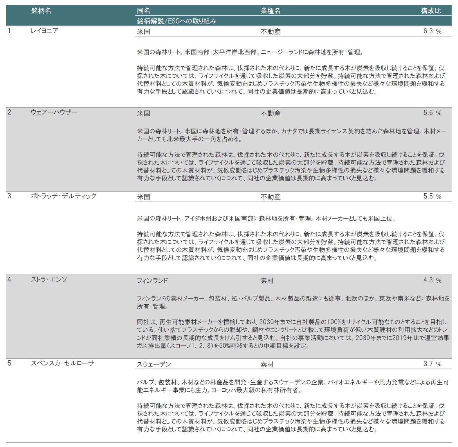 ※上記は当ファンドの主たる投資対象であるピクテ-ティンバーの状況です。 ※業種はGICS(世界産業分類基準)のセクターを基にピクテ・ジャパンで作成し、分類・表示しています。 ※表で示した組入銘柄は、特定の銘柄の勧誘や売買の推奨等を目的としたものではなく、その価格動向を示唆するものでもありません。