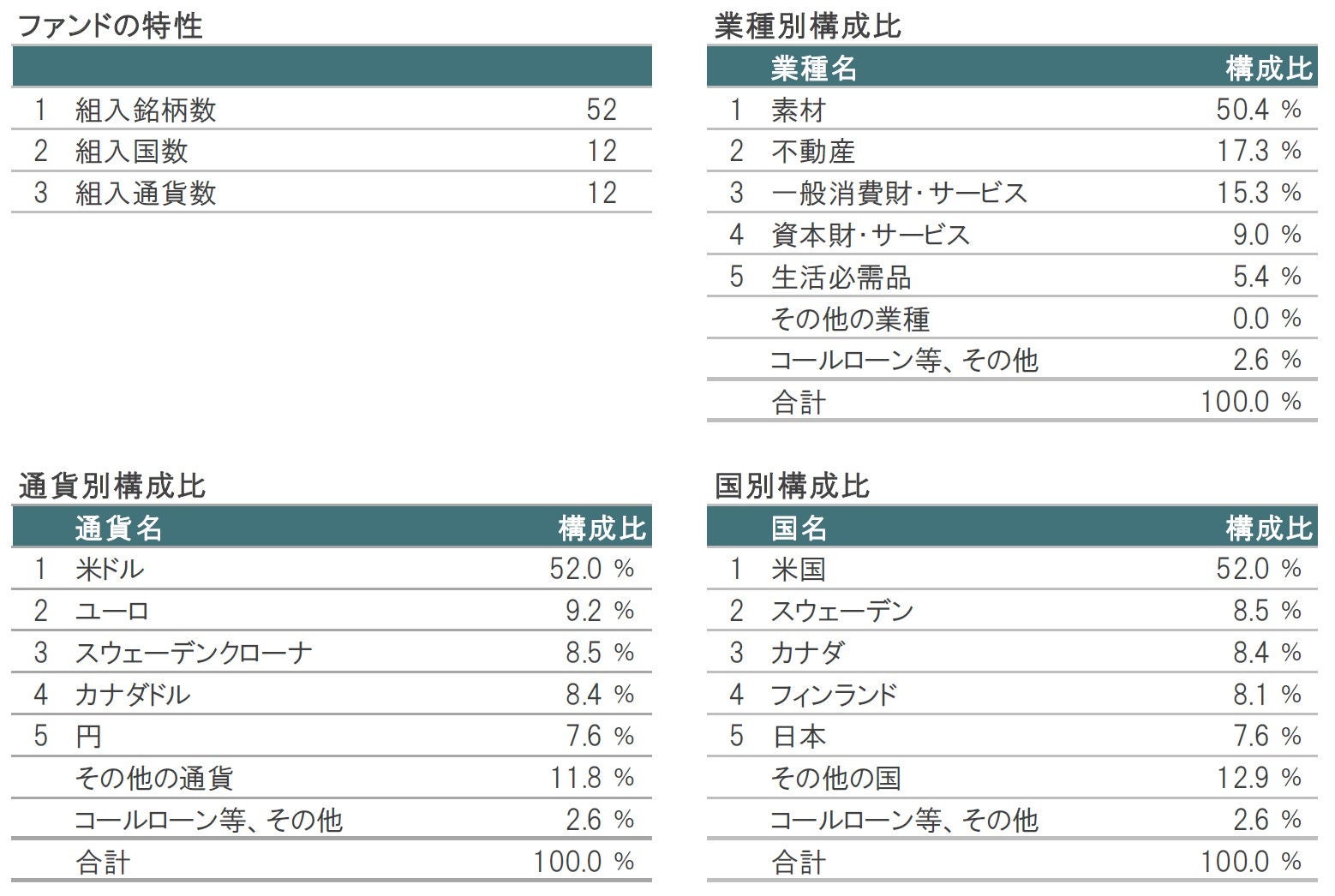 業種別構成比は、素材が50.4%と過半を占めています。素材には、木材製品関連や包装材関連、紙製品関連の銘柄などが含まれます。その他の組入業種は、不動産(北米を基盤とする森林リート)、一般消費財・サービス(住宅建設業者やホームセンター運営会社など)、資本財・サービス(建築資材メーカーや産業機器メーカーなど)、生活必需品(衛生用品メーカーなど)などとなっています。