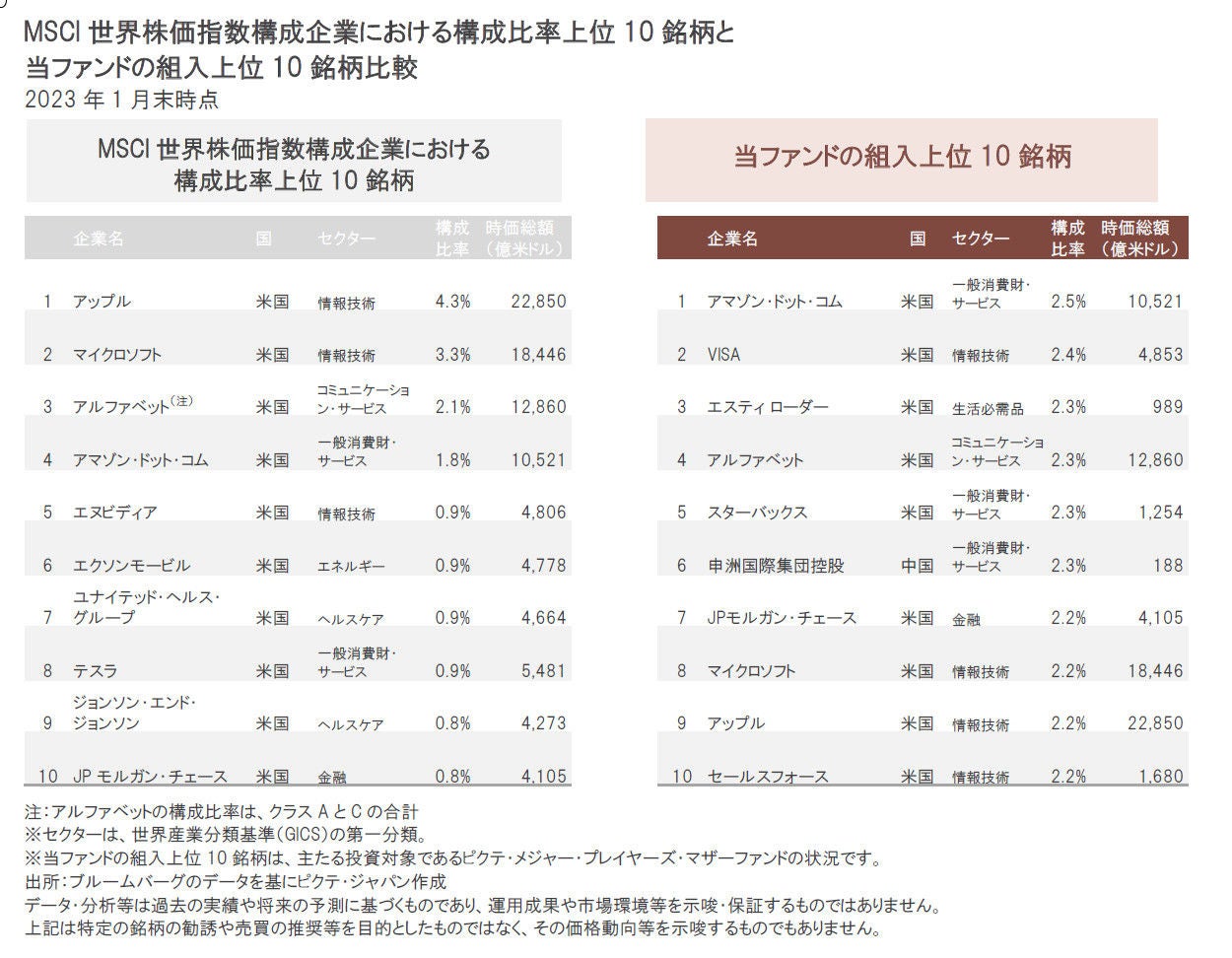 当ファンドは、世界株式の中でも、高い競争優位性をもつグローバル優良企業の株式に投資を行っています。投資銘柄の選定に際して、時価総額が大きいことを理由に組入比率を大きくすることはありません。運用チームによる個別企業の丹念な調査・分析に基づき、高い競争優位性をもつグローバル優良企業であるとの確信度が高い企業の株式を選別した上で投資を行います。また、特定の銘柄に大きく偏ることがないように組入比率を調整しています。