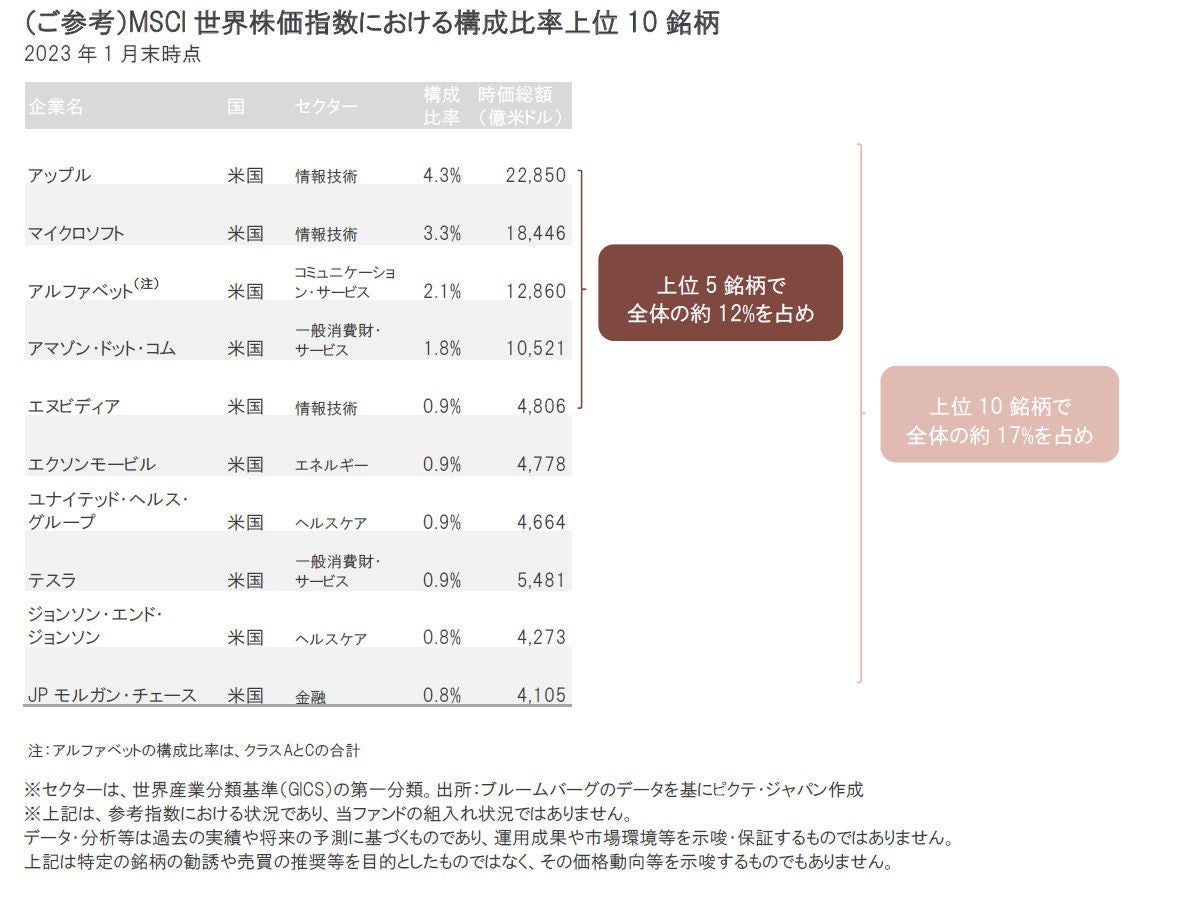 足元のMSCI世界株価指数の構成状況をみると、時価総額上位銘柄への集中度が高まっており(=時価総額の大きな銘柄の時価総額がより大きくなっている状況)、上位5銘柄で約12%、上位10銘柄で約17%となっています(2023年1月末時点)。