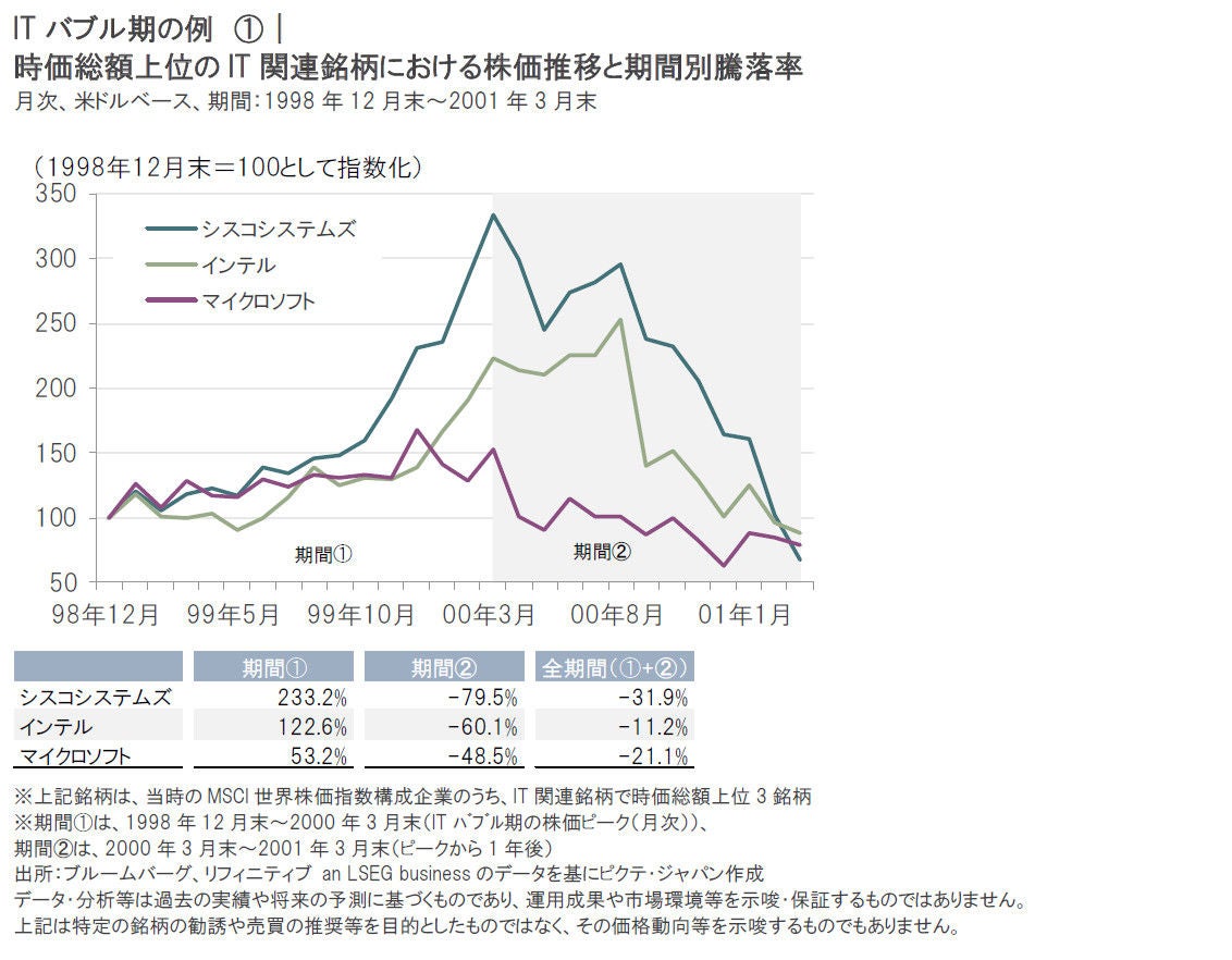 過去を振り返ると、1990年代後半から2020年代初頭のITバブル期にかけては、シスコシステムズやマイクロソフトなどが時価総額上位企業に入っており、これらのIT関連銘柄の株価が大きく上昇し、市場全体をけん引しました。しかし、その後のITバブルの崩壊局面では、これらのIT関連銘柄の株価は大幅下落に見舞われました。